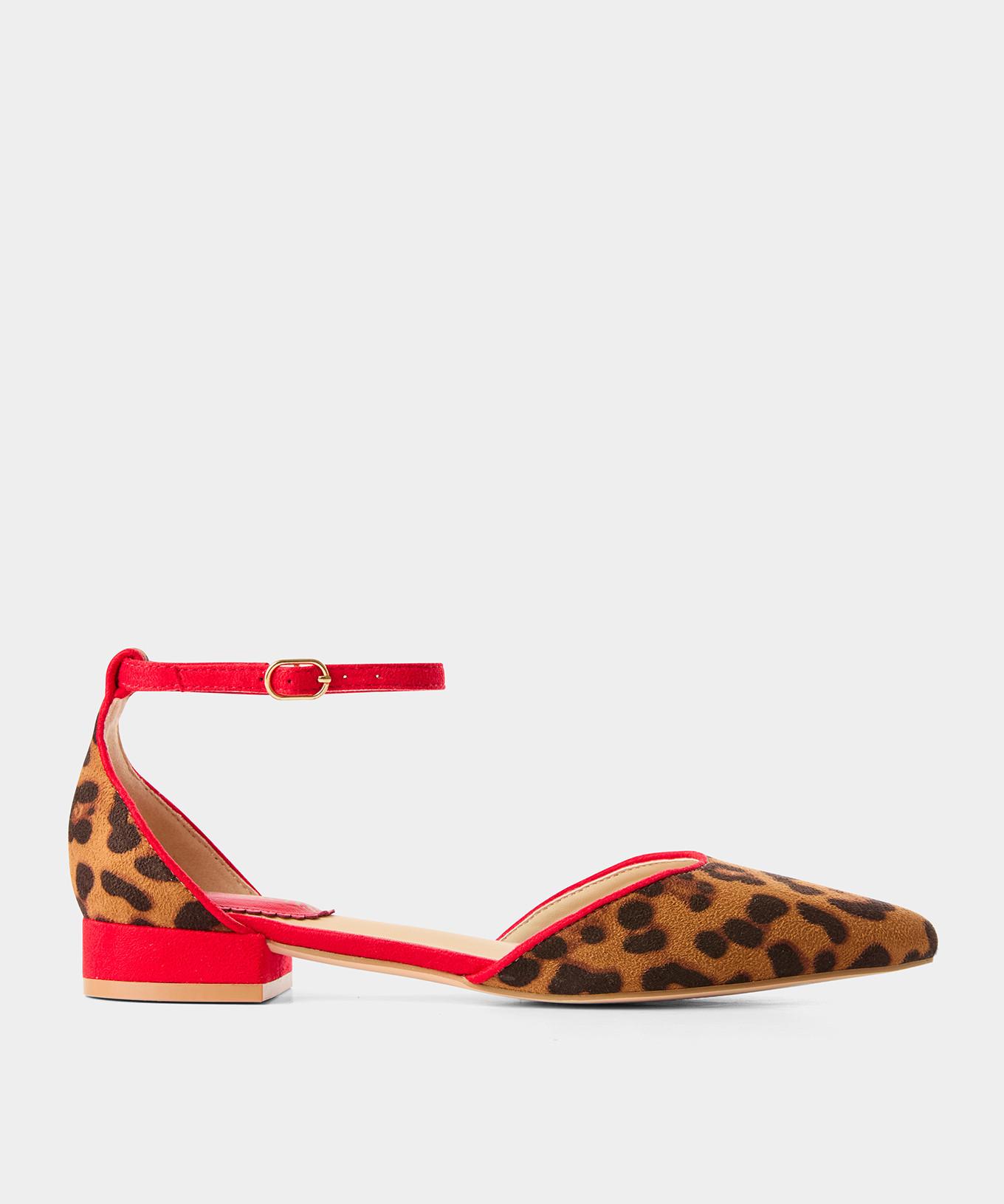 Diese flachen Mikrosuede-Schuhe kombinieren kräftige Rottöne mit einem Leopardenmuster.