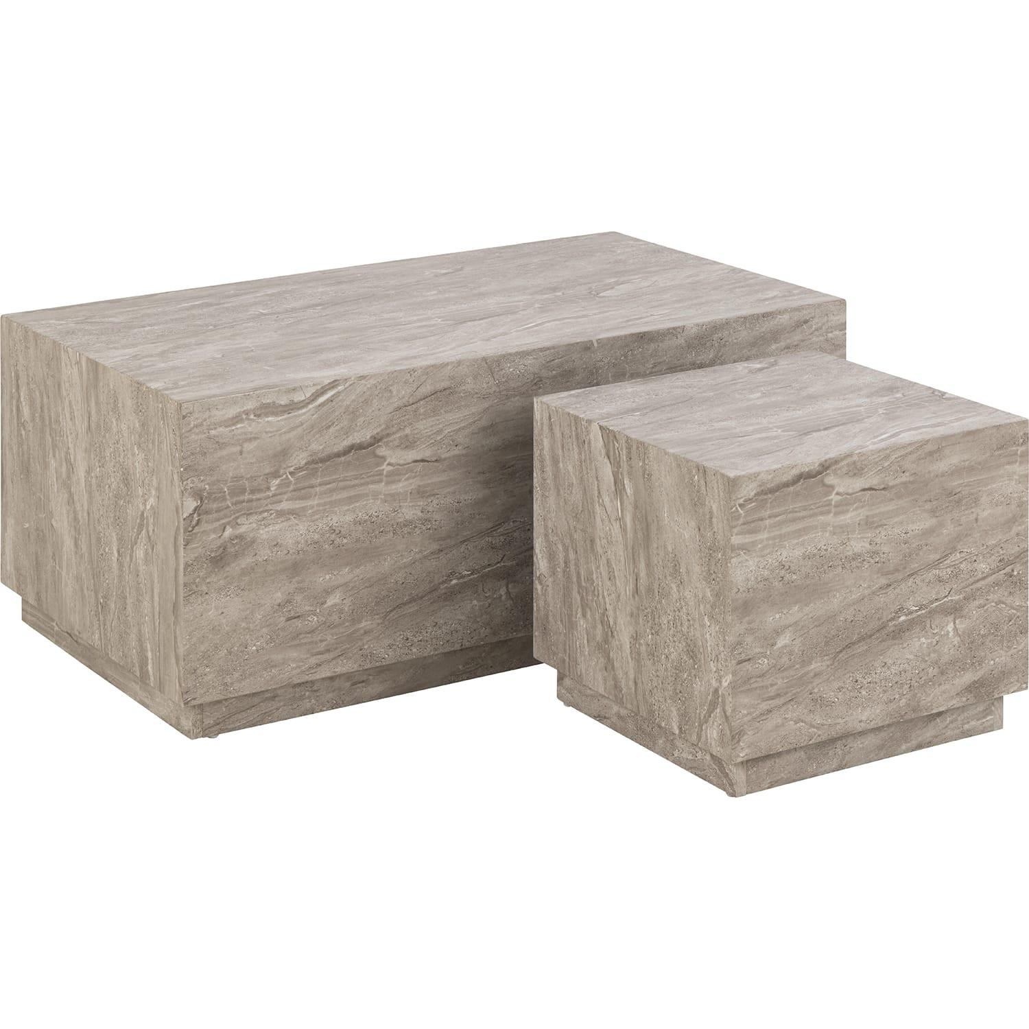 Grauer Marmor-Look verleiht Eleganz Oberfläche ist strapazierfähig und leicht zu reinigen Set aus 2 Tischen bietet vielseitige Einsatzmöglichkeiten Grösserer Tisch: 100cm x 60cm x 42cm Kleinerer Tisch: 44cm x 44cm x 38cm Bodenschutz durch Plastikfusskappen Maximale Belastbarkeit von 20 kg pro Tisch