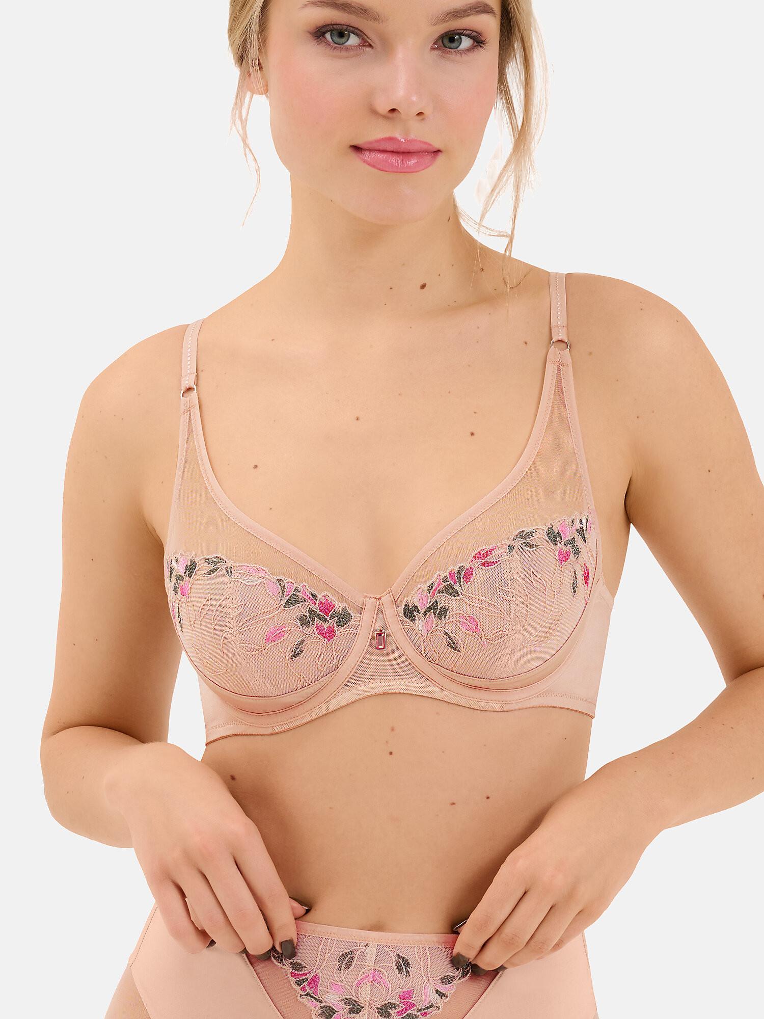 Diese Dessous sind äusserst feminin und kombinieren mehrfarbige Stickereien mit einem dezenten Blumenmuster, transparenten Einsätzen aus weichem, elastischem Tüll, elastischer Maschenware mit Perlmuttglanz, interessanten Schnitten und Metallverzierungen mit Steinen. Die Vorderseite ist luxuriös mit Stickereien verziert, die Cups sind glatt und nahtlos. Erhältlich in den sanften Farben eines blühenden Kusses und in der Farbe einer blauen Dämmerung.