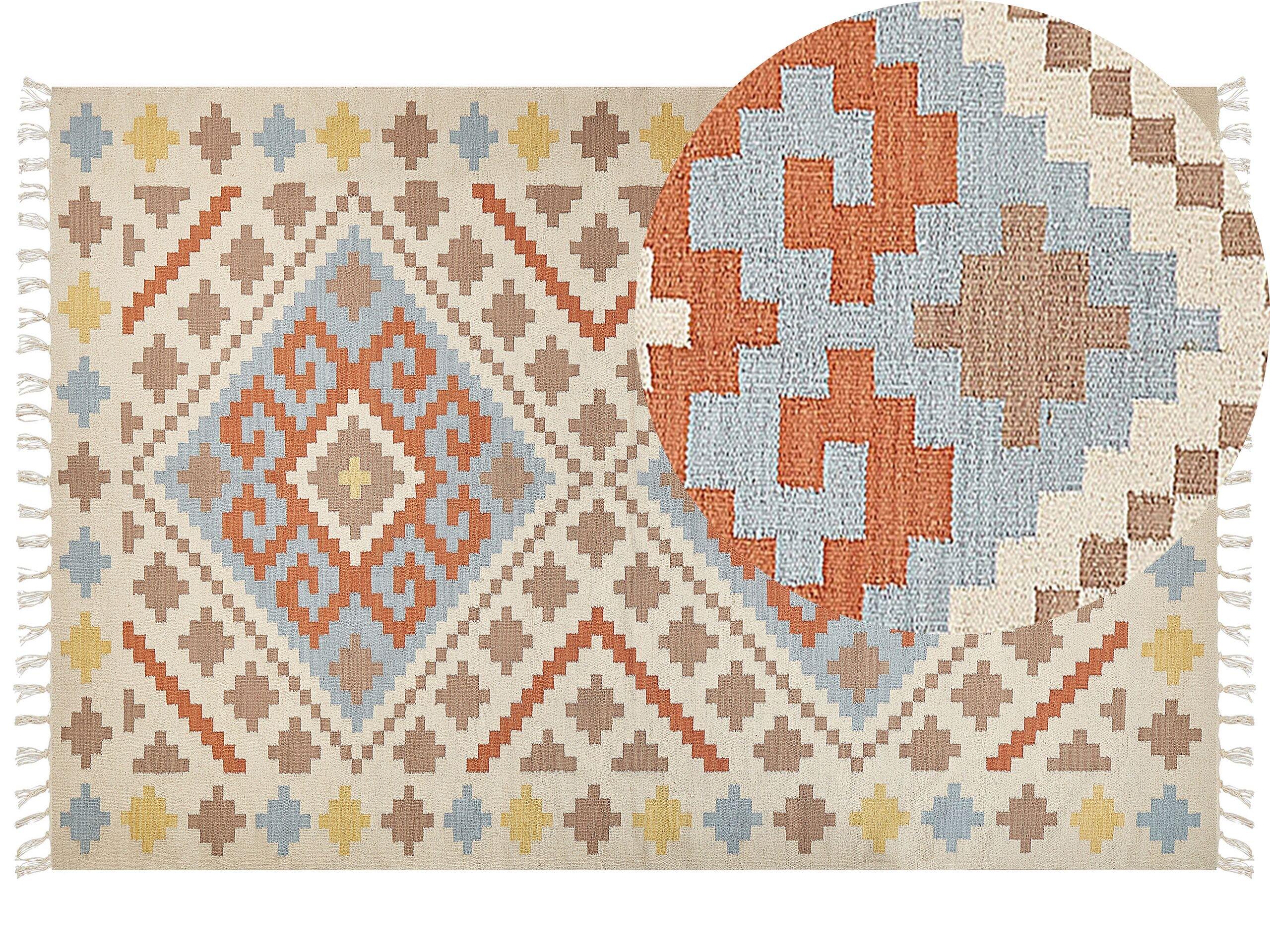 Handgewebter, rechteckiger Baumwollteppich mit geometrischem Muster und hellen Fransen. Setzen Sie auf diesen hochwertigen Kelim, der mit seinem farbenfrohen Muster jedem Ihrer Wohnbereiche mehr Wärme und einen charmanten Look verleihen wird. Traditionell in Handarbeit aus Baumwolle gewebt, bietet er hohe Qualität, die Sie jahrelang erfreuen wird. Dank dieser natürlichen Materialien und seiner angenehmen Oberfläche werden Ihre Füsse bei jedem Schritt verwöhnt. So wird er sich vor allem in stark frequentierten Wohnflächen, wie Flur, Schlaf- oder Wohnbereich beweisen. Die zusätzlichen Fransen an den Seiten des Flachgewebeteppichs verleihen ihm einen besonders anregenden Touch. Das prächtige Motiv befindet sich auf der Ober- und Unterseite des Teppichs, so kann er beidseitig benutzt werden.