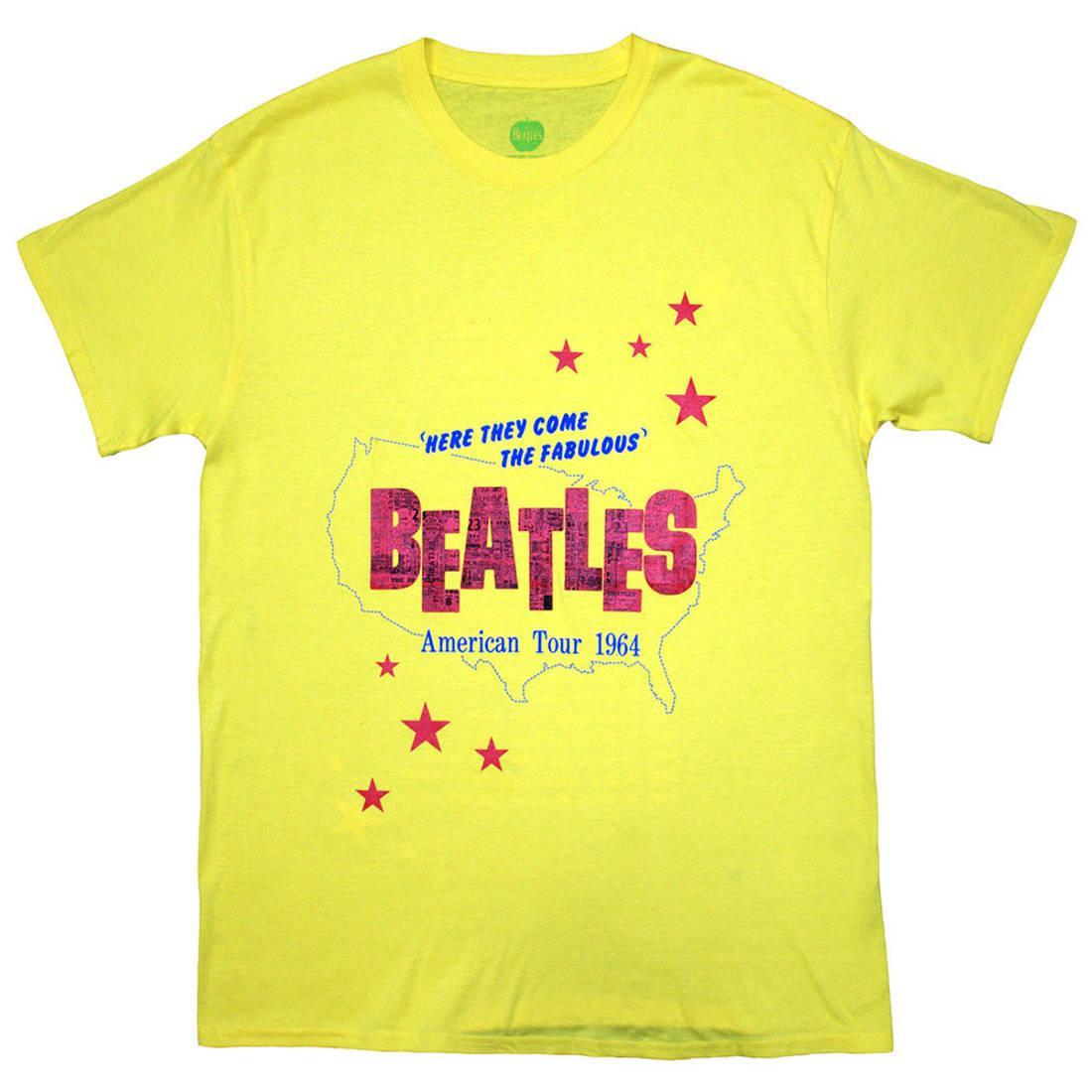 Dieses T-Shirt zeigt einen grafischen Druck, der von der ikonischen American Tour von 1964 inspiriert ist. Die Vorderseite präsentiert eine Karte der Vereinigten Staaten mit dem Text "HERE THEY COME THE FABULOUS BEATLES American Tour 1964", akzentuiert mit Sternen. Die Rückseite listet die Tourdaten und Veranstaltungsorte auf, was es zu einem einzigartigen Stück für Fans macht.
