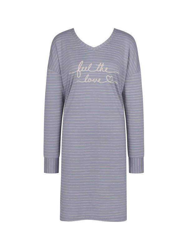 Dieses lässige Nachthemd bietet eine bequeme Passform, perfekt für entspannte Abende. Das Design verfügt über einen V-Ausschnitt und lange Ärmel, die ein gemütliches Gefühl vermitteln. Die Vorderseite ist mit einem charmanten "feel the love"-Aufdruck verziert, der dieser Nachtwäsche einen Hauch von Süße verleiht.