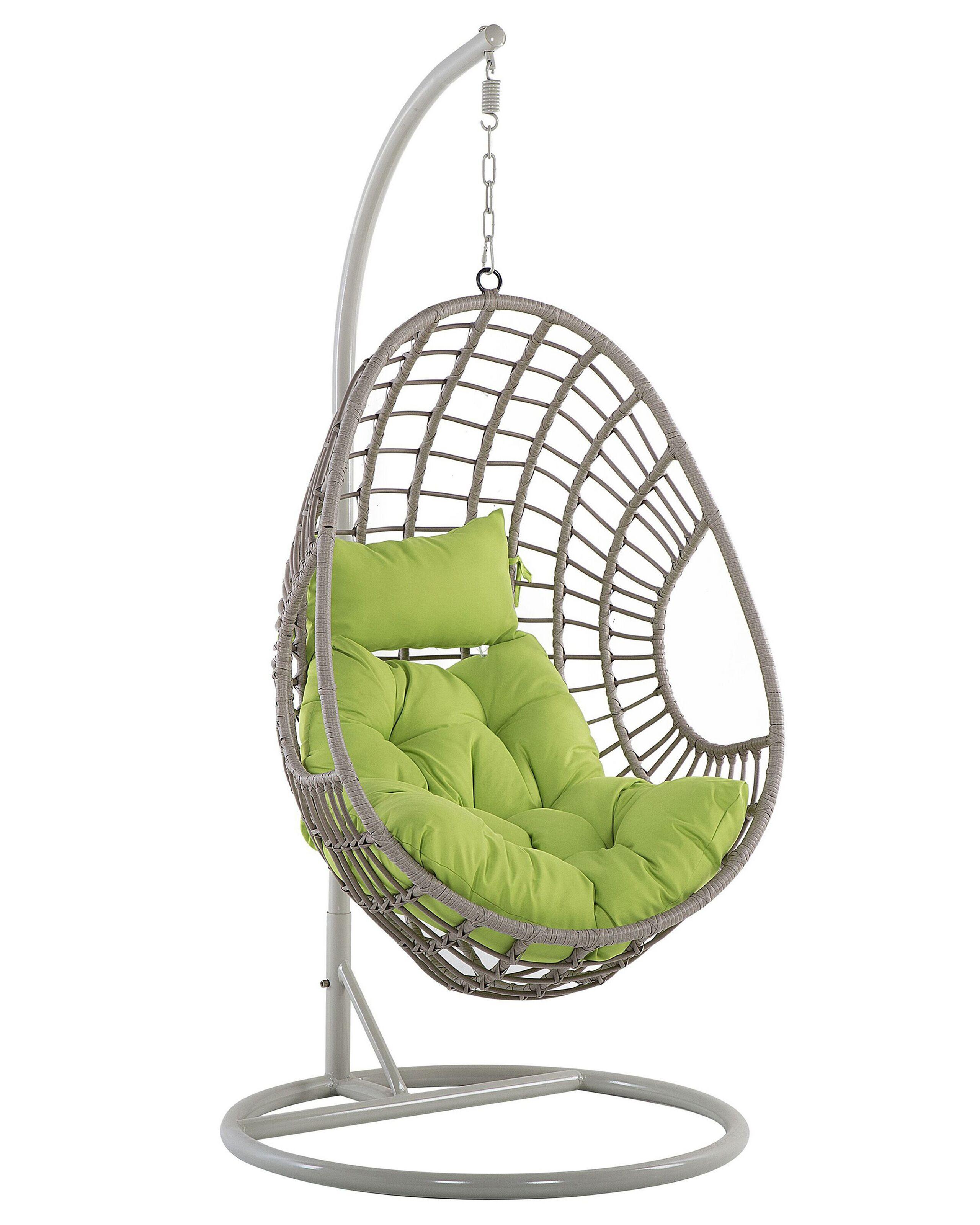 Eiförmiger Hängesessel aus Rattan inkl. Kissen. In diesem praktischen Sessel werden Sie sich jederzeit entspannen können. Der moderne Korb wird mit einem dicken Sitzkissen und Kopfkissen in einem frischen Grünton kombiniert. Sie zeichnen sich durch ihren aussergewöhnlichen Komfort aus. Die Sitzfläche hängt an einem stabilen Gestell, das es ermöglicht, den Hängesessel in jedem Innenraum oder Wintergarten zu platzieren. Das formschöne, einzigartige Rattan-Geflecht sorgt für einen luftigen, lässigen Look.