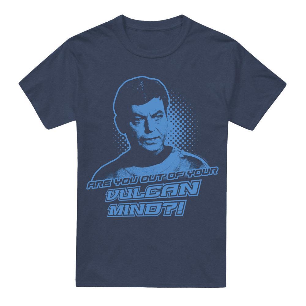 Dieses T-Shirt zeigt einen grafischen Aufdruck eines Charakters mit dem Text "ARE YOU OUT OF YOUR VULCAN MIND?!" auf der Vorderseite. Es ist mit einem klassischen Rundhalsausschnitt und kurzen Ärmeln gestaltet und bietet eine bequeme und vielseitige Passform für den Alltag.
