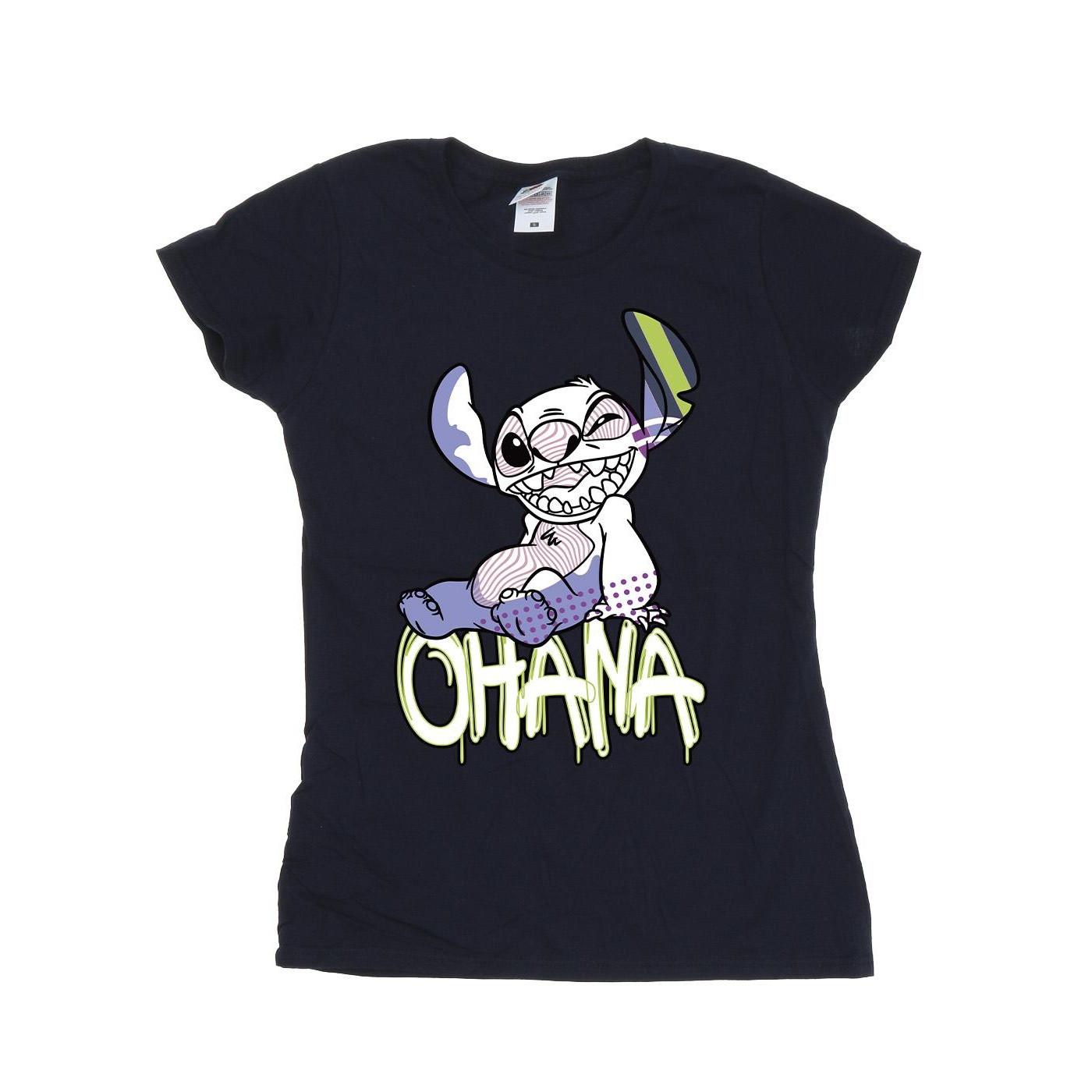 Dieses Grafik-T-Shirt zeigt ein verspieltes Design von Stitch aus Disneys Lilo & Stitch, der über dem Wort "OHANA" sitzt. Der lebendige Druck verleiht diesem klassischen Kurzarm-T-Shirt eine lustige und lässige Note.