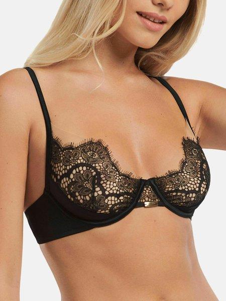 Attraktive Spitze in Kombination mit hautfarbenem Tüll und seidigem Stoff schafft eine verführerische und elegante Serie für mutige und selbstbewusste Frauen. Diese luxuriöse Dessous bietet einen Hauch von französischer Romantik und italienischem Hedonismus. Der gewagte Schnitt und die Materialkombination lassen jede Frau sich wie eine Diva fühlen, sei es im unverzichtbaren Schwarz oder in den neuen perlmuttgoldenen Farben. Die hautfarbene Transparenz übernimmt die Funktionalität unter den sich überlagernden Spitzenwellen mit Tattoo-Effekt und hebt sie gleichzeitig hervor. Goldene Elemente und Regler betonen die Eleganz zusätzlich. Einige Modelle sind mit feinen, dekorativen Riemen versehen.