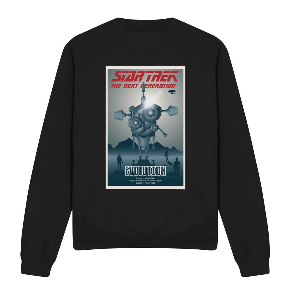 Dieses Sweatshirt zeigt einen grafischen Druck, inspiriert von Star Trek: The Next Generation Staffel 3 Episode 1, "Evolution". Das Design fängt die Essenz der Episode mit einer detaillierten Illustration ein und macht es zu einem unverwechselbaren Stück für Fans.