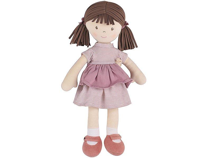 Die Kuschelpuppe Brook misst 38 cm und ist optimal für Kuschel- und Spielstunden geeignet. Ihr bezauberndes Kleid kombiniert gemusterte und einfarbige Stoffe und wird durch eine hübsche Strickblume ergänzt. Hergestellt aus 100% Baumwolle ist die Puppe sowohl hochwertig als auch umweltfreundlich, da die Faserfüllung aus recycelter Polyesterwatte besteht.