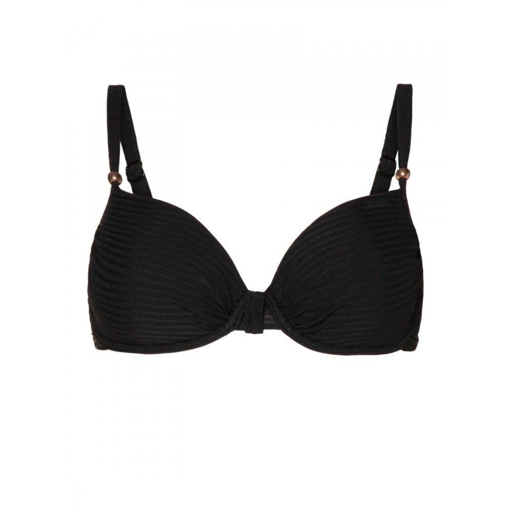 Dieses Bikini-Oberteil besteht aus einem strukturierten schwarzen Stoff. Es ist Teil der Mix&Match-Serie, wodurch es mit verschiedenen Bikini-Unterteilen kombiniert werden kann. Speziell für größere Brüste entwickelt, verfügt es über eine Bügelkonstruktion und integrierte Schaumstoffkörbchen für zusätzlichen Halt. Die perlenbesetzten Träger sind für eine perfekte Passform verstellbar. Der Stoff ist PFC-frei, was die Verwendung schädlicher Chemikalien und deren Umweltauswirkungen reduziert.