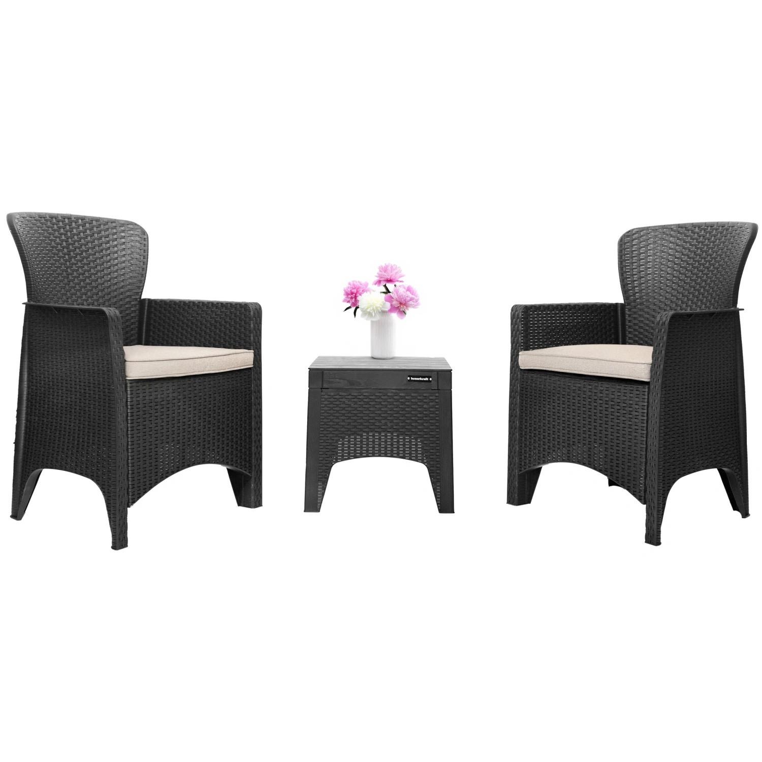 Verwandeln Sie Ihren Außenbereich mit diesem stilvollen Gartenmöbel-Set – perfekt für Gärten, Terrassen und Balkone. Das Set für zwei Personen besteht aus zwei Sesseln und einem Tisch aus strapazierfähigem Polypropylen mit schickem Technorattan-Finish. Genießen Sie den Komfort der 5 cm dicken Kissen aus wasserabweisendem Stoff und entspannen Sie bei jedem Wetter. Dieses Set besticht nicht nur durch seine Optik; es ist wetterfest und gleichzeitig einfach aufzubauen und zu pflegen.