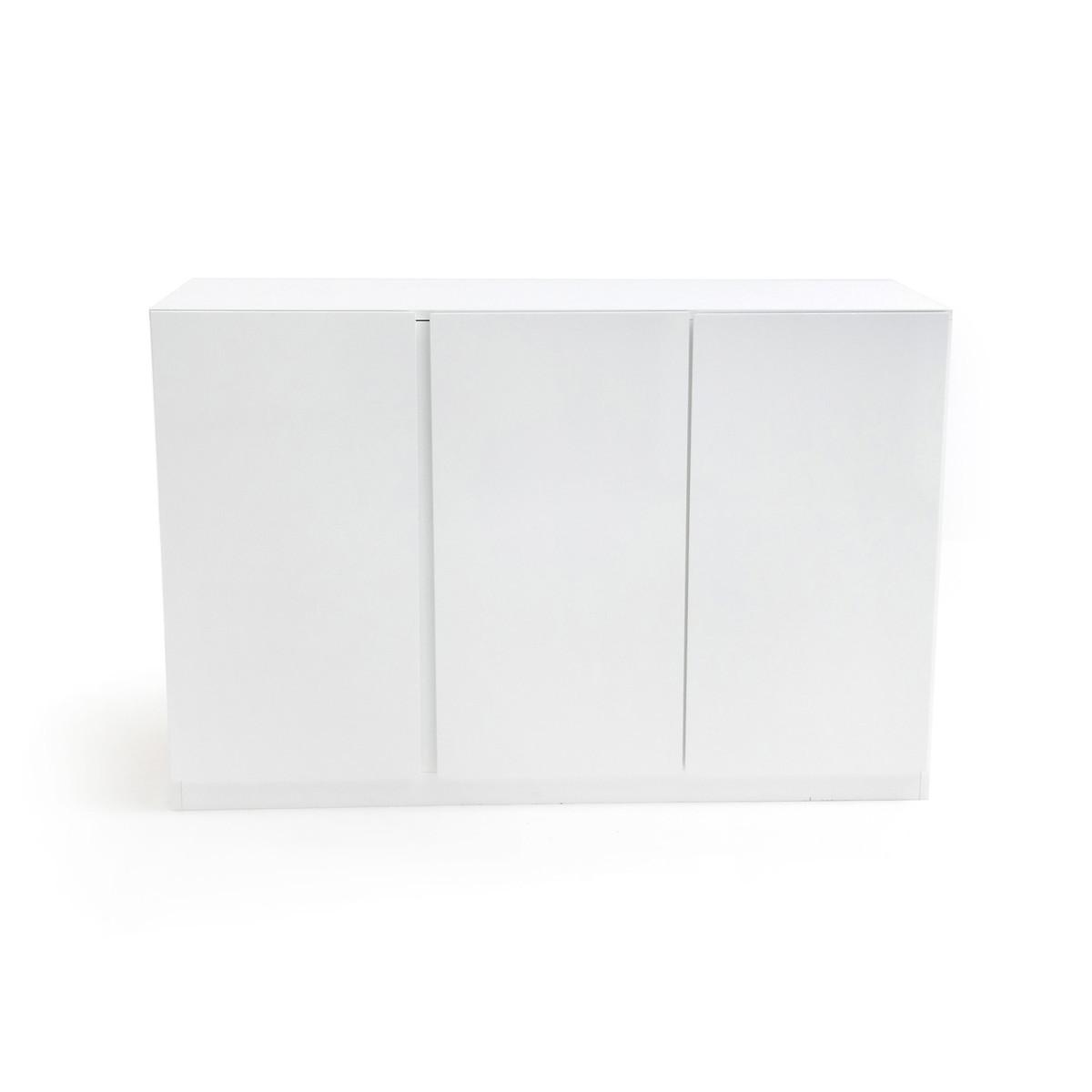 Der niedrige Schrank Leo mit Hochglanzlackierung überzeugt durch ein durchdachtes Design mit 3 Türen und optimalem Stauraum.