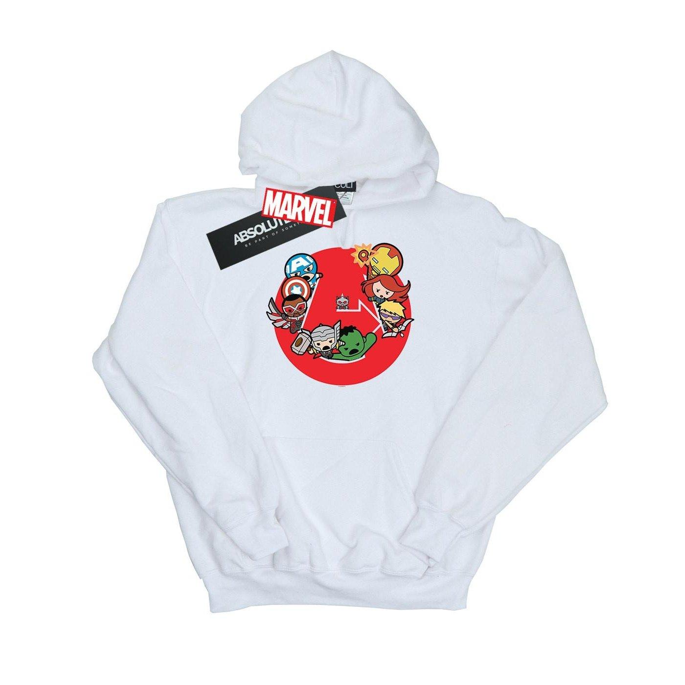 Dieser Kapuzenpullover zeigt eine verspielte Grafik von Avengers-Charakteren im Chibi-Stil, darunter Captain America, Iron Man, Thor, Hulk und Black Widow, die sich um einen roten Kreis versammeln. Das Design vermittelt eine lustige, actionbereite Stimmung, perfekt für Fans des ikonischen Superhelden-Teams.