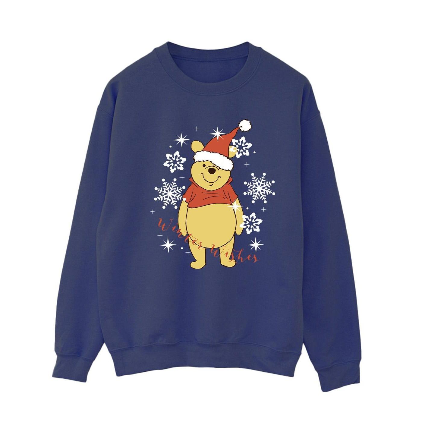 Dieses Sweatshirt zeigt ein festliches Design mit Winnie Puuh, der eine Weihnachtsmütze trägt, umgeben von Schneeflocken und dem Text „Winter Wishes“. Es ist eine bequeme und stilvolle Option für die Weihnachtszeit.