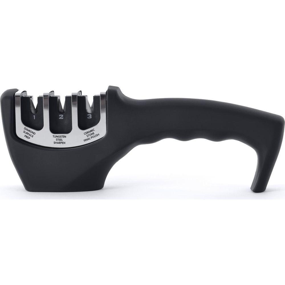 Stumpfe Messer sind nun Vergangenheit! Mit diesem leichten Messerschleifer können Sie Ihre Küchenmesser in nur 3 einfachen Schritten schleifen. Die Diamantoberfläche bereitet die Messer auf das Schärfen vor, der Wolframstahl stellt die V-Form der Schneide wieder her und der Keramikstein poliert die Schneide und entfernt letzte Unregelmässigkeiten. Der Komfort-Griff des Messerschleifers sorgt für die perfekte Balance und eine hohe Kontrolle.