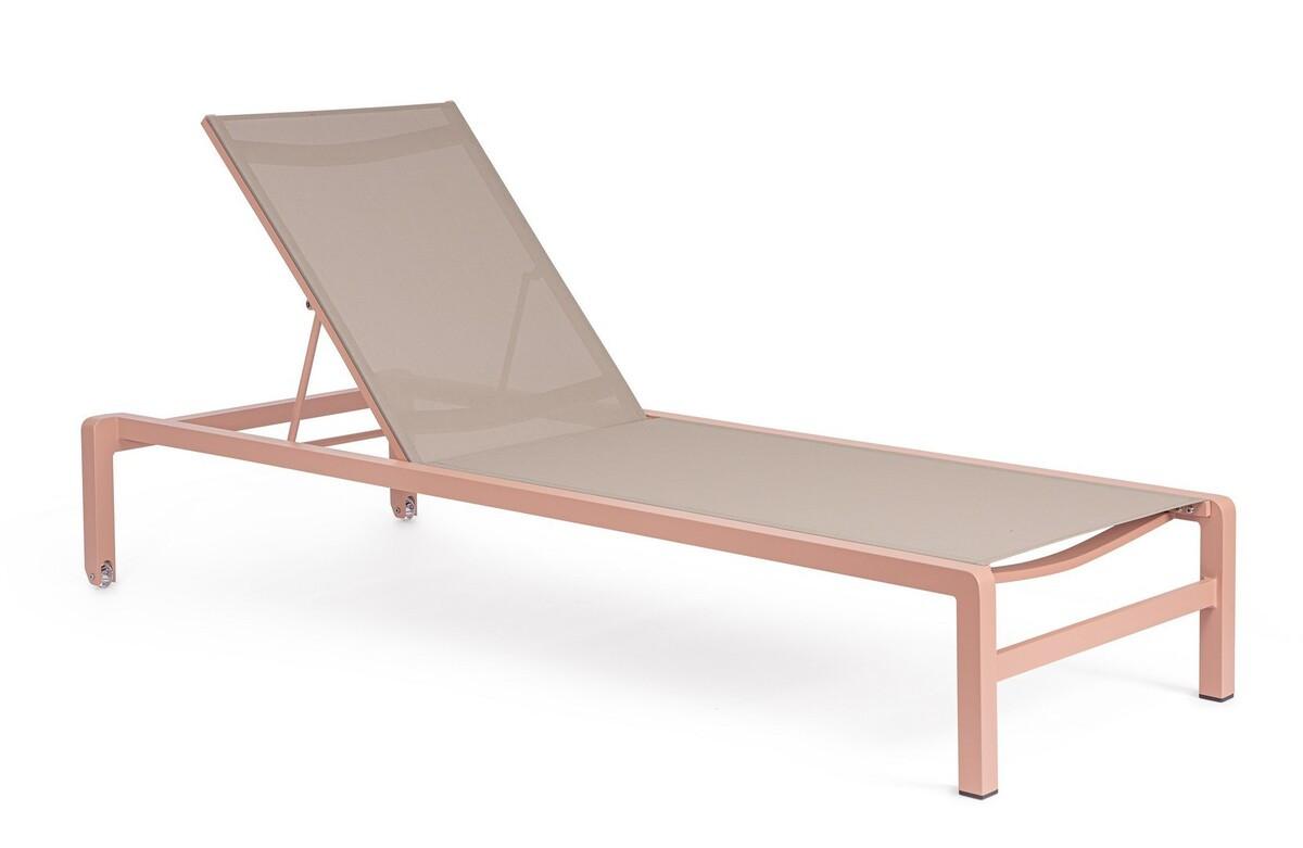 Aluminiumgestell mit Polyester-Pulverbeschichtung Sitz und Rückenlehne aus wetterfestem Textilene Rückenlehne klappbar in 6 Positionen Leicht beweglich dank Kunststoffrädern Edelstahlschrauben für erhöhte Haltbarkeit Stapelbar für platzsparende Aufbewahrung Erhältlich in Beige, Rosa und Braun