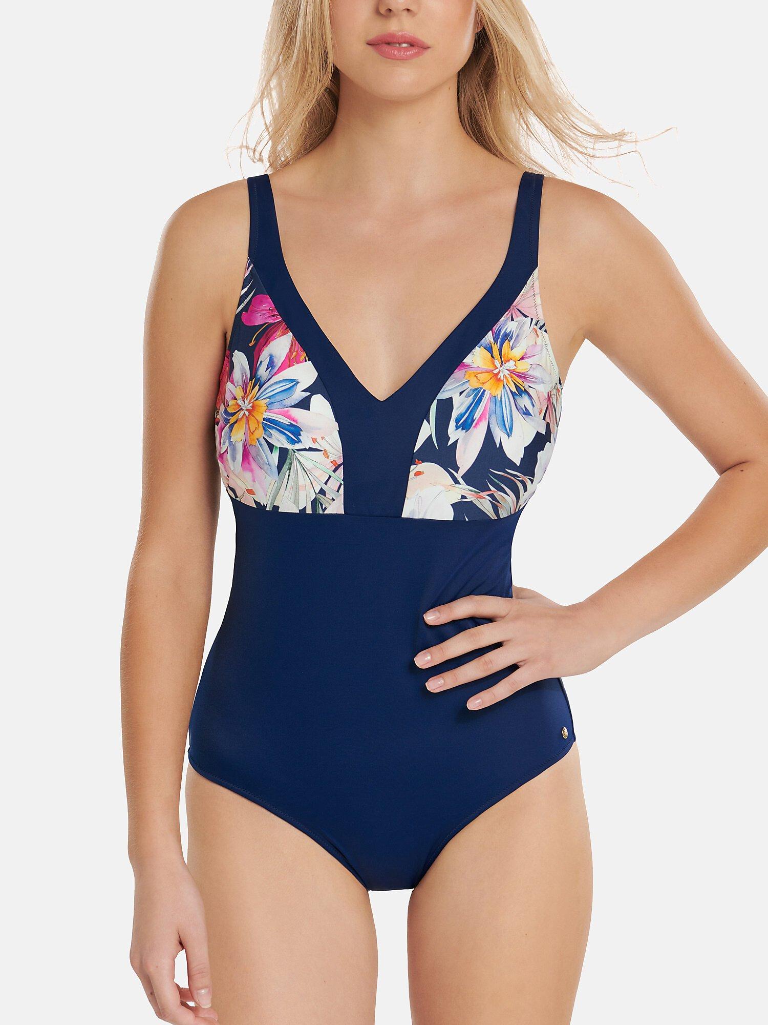 Dieser vorgeformte einteilige Badeanzug aus der Tunis Kollektion bietet einen bequemen und stützenden Sitz ohne Bügel. Das funktionelle Design mit breiteren Trägern ist für große Größen geeignet. Der obere Teil des Badeanzugs hat ein dreieckiges Aussehen, das sich im Rücken fortsetzt. Die oberen Vorder- und Rückenteile sind aus bedrucktem Stoff. Die einfarbigen Unterteile vorne und hinten machen die weibliche Silhouette im unteren Bereich der Hüften optisch schlanker. Die Träger können mithilfe des Verschlusses auf dem Rücken abgenommen werden, sodass sie überkreuzt oder um den Hals gebunden werden können. Sie sind verstellbar, um eine perfekte Passform zu gewährleisten.