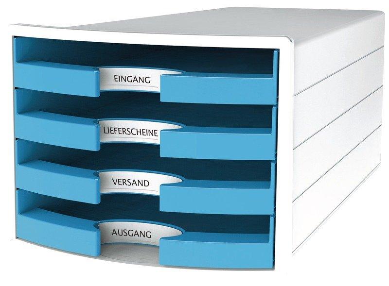 IMPULS - Schubladenelement Schubladenbox IMPULS in moderner Optik mit 4 geschlossenen großzügigen Schubladen für Papierformate DIN A4/C4. Innovatives, attraktives Design in höchster Qualität. Inkl. großer auswechselbarer Beschriftungsschilder für ein einfaches Auffinden von Unterlagen. Leichtlaufende Schubladen mit Auszugssperre und durchgängig geschlossenen Boden auch zur Kleinteile Organisation geeignet. Extra stabiles Gehäuse aus einem Stück gefertigt. Stapelbar, dadurch Platz sparend. Rutschfeste, möbelschonende Gummifüße sorgen für einen sicheren Stand. Für Format A4/C4 Aussenmasse (B x H x T): 294 x 235 x 368 mm Innenmasse der Schubladen (B x H x T): 240 x 37 x 325 mm, Polystyrol (PS) 4 offene Schubladen mit Auslaufsperre Inkusive auswechselbarem Beschriftungsschild.