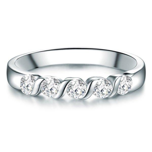 Wer einen modernen Memoirering sucht, trifft mit dieser Kreation der Manufaktur Trilani eine hervorragende Wahl: Fünf funkelnde Zirkoniasteine werden in raffinierter Wickeloptik in einer gewundenen Fassung gehalten und lenken garantiert alle Blicke auf die Hand Ihrer Liebsten. Der präzise Brillantschliff verleiht den 57 Facetten der Zirkoniasteine das unvergleichliche Feuer von Diamanten. Rhodiniertes 925er Sterlingsilber macht dieses außergewöhnliche Schmuckstück für jedes Budget erschwinglich. Der filigrane Ring ist nicht nur ein bezaubernder Verlobungsring, sondern kann auch nach der Hochzeit hervorragend als Beisteckring getragen werden.