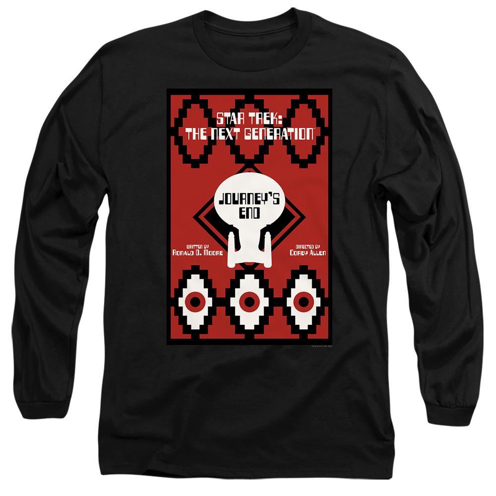Dieses T-Shirt zeigt einen Grafikdruck, inspiriert von Star Trek: The Next Generation Staffel 7 Episode 20, "Journey's End". Das Design fängt die Essenz der ikonischen Science-Fiction-Serie ein und ist eine unverwechselbare Ergänzung für jede Fan-Sammlung.