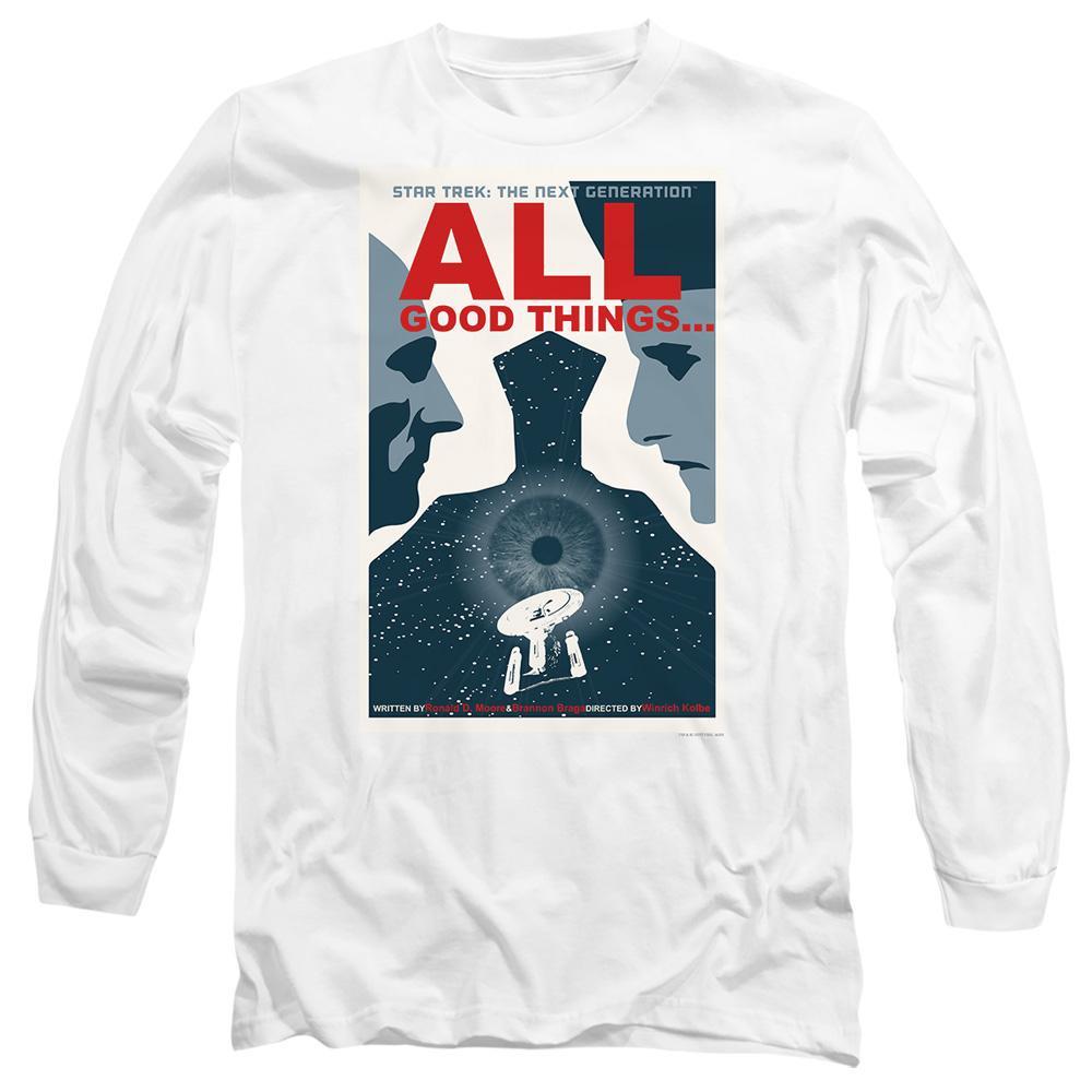 Dieses T-Shirt zeigt einen Grafikdruck, der von "All Good Things...", der letzten Episode von Star Trek: The Next Generation, inspiriert ist. Das Design fängt die Essenz des ikonischen Serienfinales ein und macht es zu einem unverwechselbaren Stück für Fans.