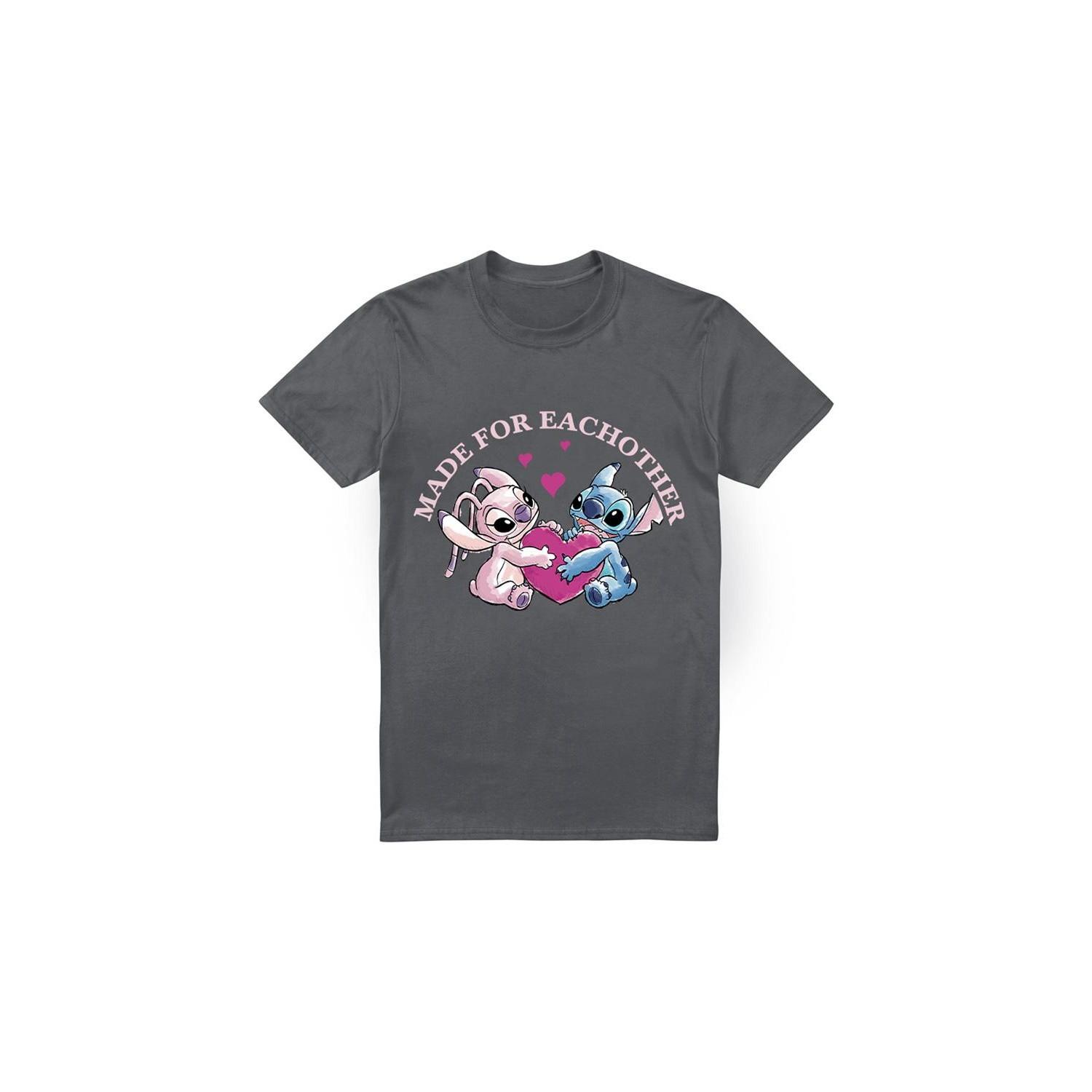 Dieses T-Shirt zeigt einen charmanten Grafikdruck von zwei beliebten Figuren, Lilo und Stitch, die sich ein Herz teilen, mit dem Text „MADE FOR EACH OTHER“ darüber. Der klassische Rundhalsausschnitt und die kurzen Ärmel machen es zu einer vielseitigen Ergänzung für jede Freizeitgarderobe.