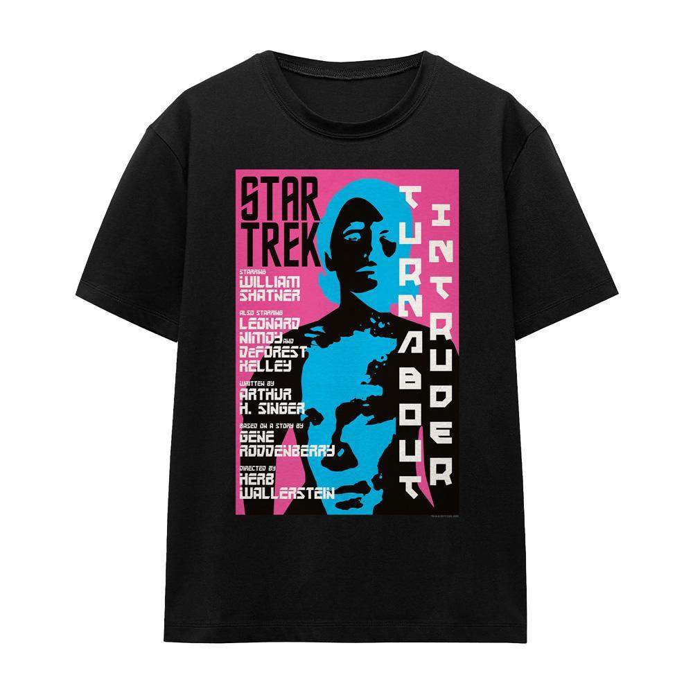 Dieses T-Shirt zeigt einen Grafikdruck, der von Star Trek: The Original Series, insbesondere Episode 79, inspiriert ist. Das Design präsentiert eine stilisierte Darstellung eines Charakters in leuchtendem Blau und Schwarz vor einem rosa Hintergrund, mit Textdetails wie "STAR TREK" und Informationen zu Besetzung/Crew. Dieses T-Shirt ist eine bequeme und stilvolle Möglichkeit, eine klassische Science-Fiction-Serie zu feiern.