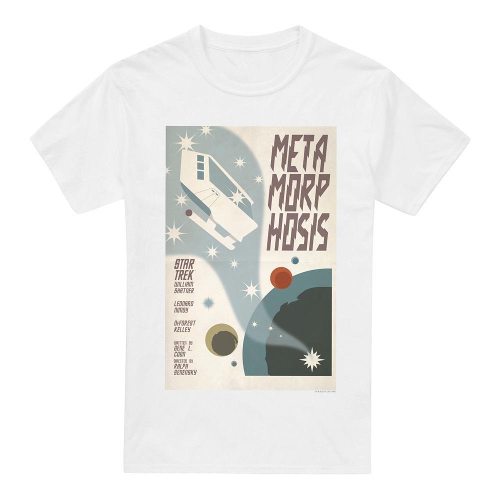 Dieses T-Shirt zeigt einen Grafikdruck, inspiriert von "Metamorphosis", Episode 38 von Star Trek: The Original Series. Das Design präsentiert eine retro-futuristische Ästhetik mit einem Raumschiff, Himmelskörpern und Sternen, zusammen mit dem Episodentitel und den Namen der Hauptdarsteller und der Crew. Es besteht aus 100% Baumwolle und ist offiziell lizenziert.