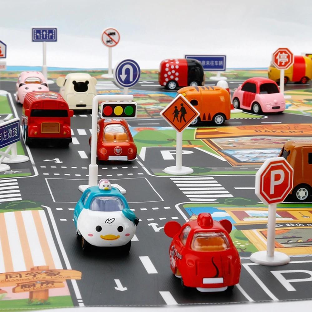Große wasserdichte Kindermatte mit Stadtmuster und Zubehör. Hergestellt aus wachstuchähnlichem Kunststoff, sehr dünn und leicht. Im Set sind unter anderem 18 verschiedene Straßenschilder und 18 Aufkleber enthalten. Abmessungen: 130 x 100 cm