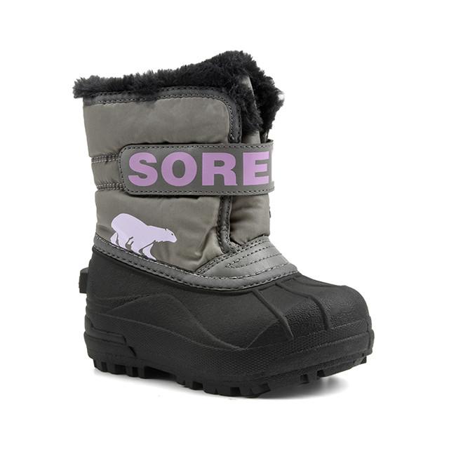 Die Schneestiefel Snow Commander der Marke Sorel sind für Kinder gedacht, die im Winter Outdoor-Aktivitäten lieben. Diese robusten, funktionellen Stiefel verfügen über eine wetterfeste Gummisohle, ideal für Schnee oder Eis. Die Innenseite des Stiefels ist mit einem warmen Textil gefüttert, um die Füße warm zu halten, auch bei den kältesten Temperaturen. Die Innensohle ist abnehmbar und aus Textil für eine bessere Belüftung und Anpassung an den Fuß. Die Stiefel sind dank ihres Obermaterials aus Gummi und Textil wasserdicht und schützen die Füße vor Witterungseinflüssen. Boot-Details sind ein Klettverschluss Schultergurt und ein Sorel Markenlabel in weißen Buchstaben auf lila Hintergrund, sowie eine kleine Grafik eines Eisbären in der Nähe der Basis des Stiefels. Die Snow Commander Stiefel sind in grau erhältlich und eignen sich perfekt für Kinder, die gerne im Schnee spielen.