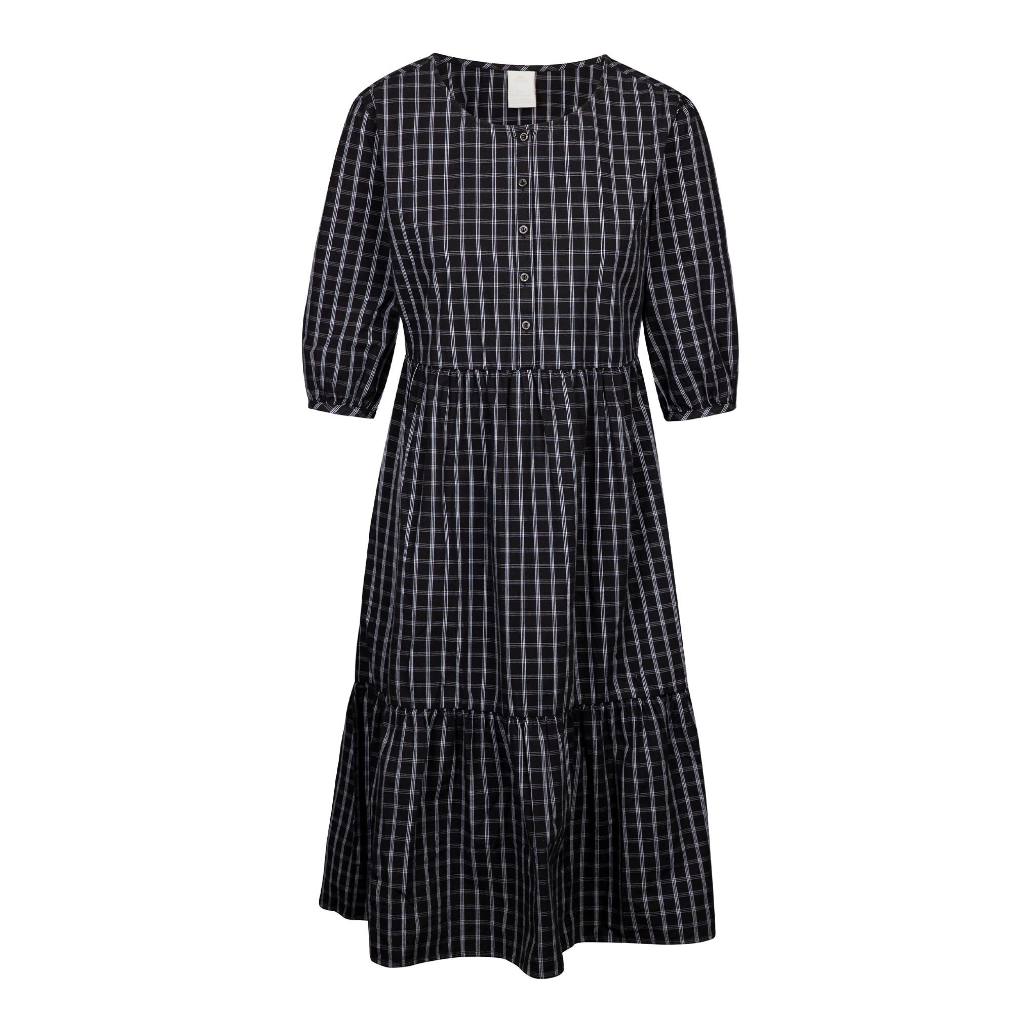Das Kleid zeichnet sich durch seinen gestuften Saum aus, der dem Kleid Bewegung und eine entspannte Silhouette verleiht. Ein Knopfverschluss zieht sich über die Vorderseite und unterstreicht den klassischen Charme.