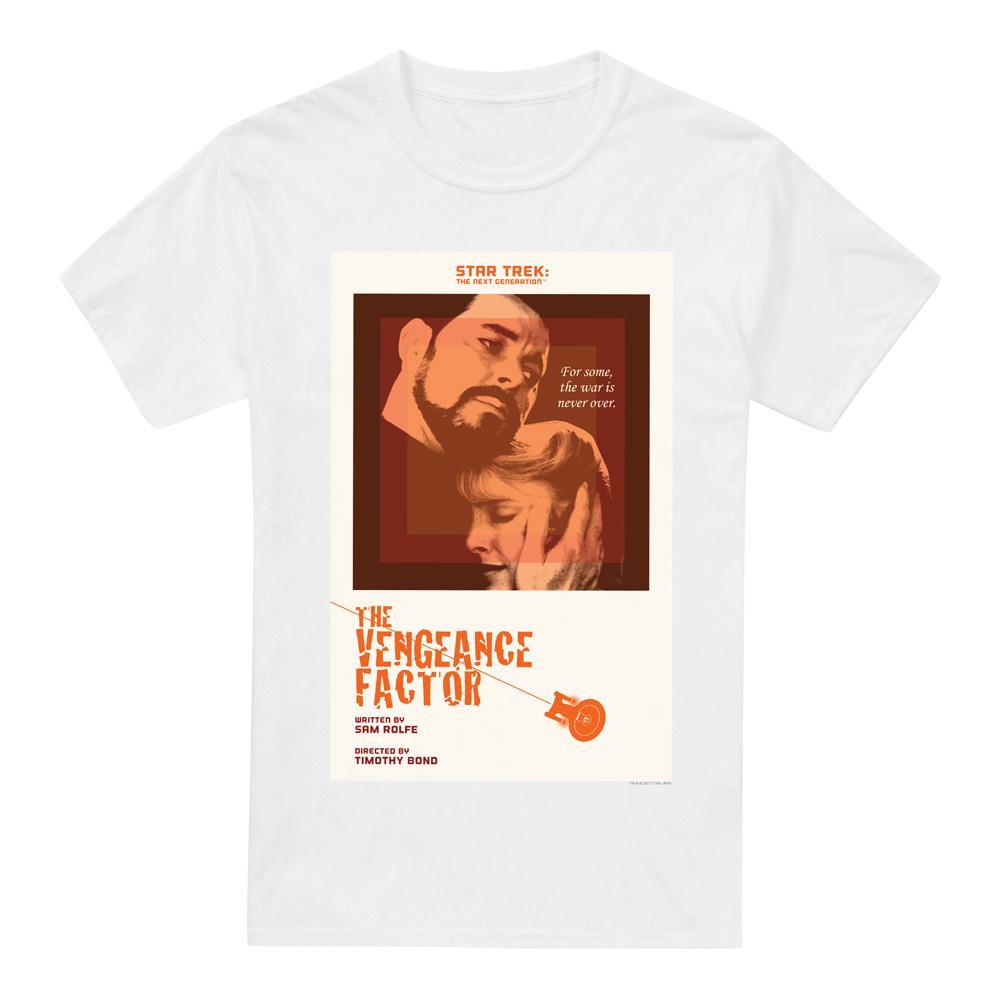 Dieses T-Shirt zeigt einen Grafikdruck, der von "The Vengeance Factor", Staffel 3 Episode 9 von Star Trek: The Next Generation, inspiriert ist. Das Design fängt die Essenz der Episode mit einer markanten Optik ein.