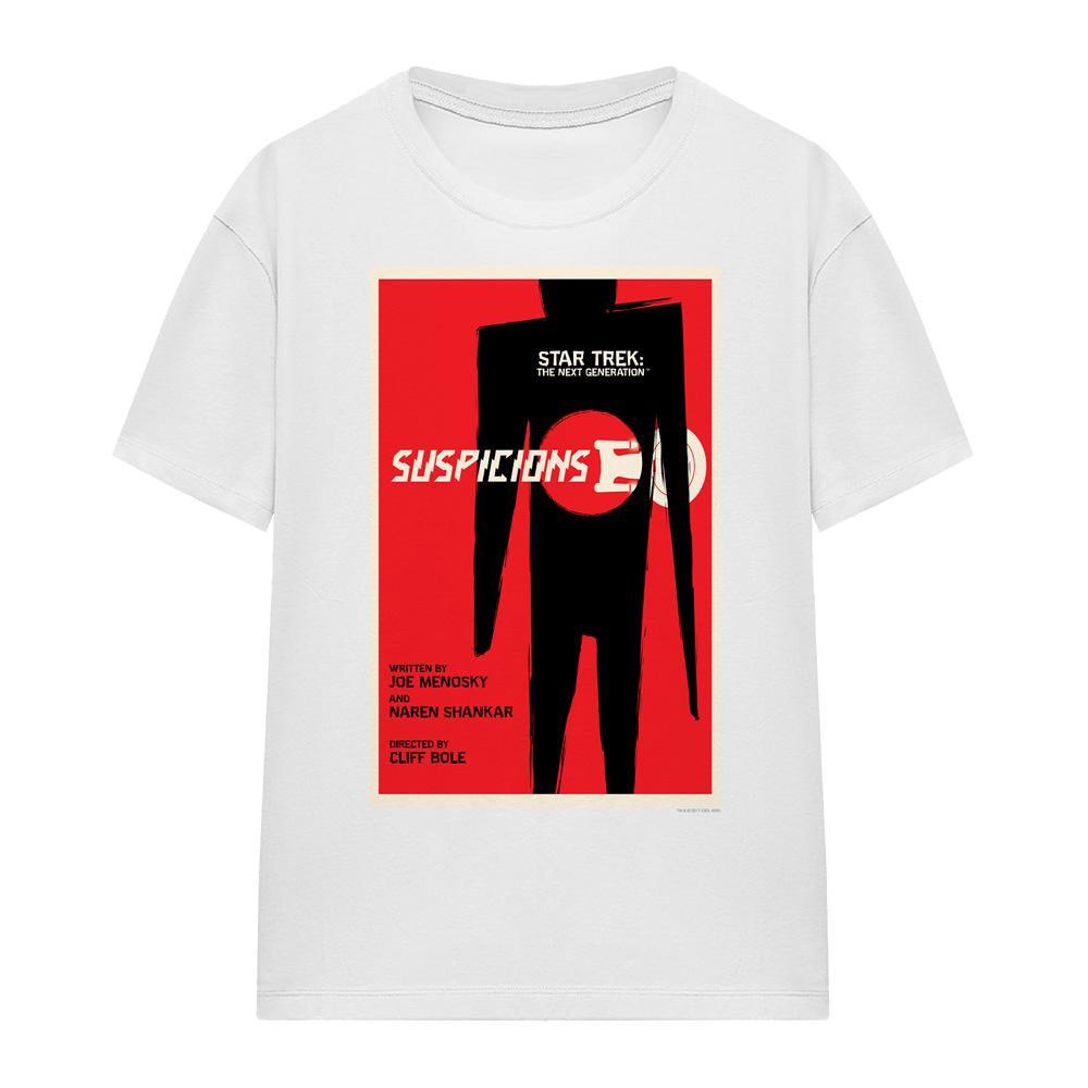 Dieses T-Shirt zeigt einen Grafikdruck, inspiriert von "Star Trek: The Next Generation" Staffel 6, Episode 22, mit dem Titel "Suspicions". Das Design fängt die Essenz der Episode mit einer markanten Optik ein.