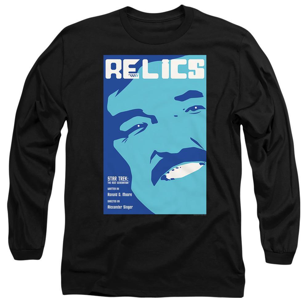 Dieses T-Shirt zeigt einen Grafikdruck, inspiriert von "Relics", Staffel 6 Episode 4 von Star Trek: The Next Generation. Das Design präsentiert eine stilisierte Darstellung von Montgomery Scott, wobei der Episodentitel prominent angezeigt wird. Es ist eine bequeme und stilvolle Wahl für Fans der ikonischen Science-Fiction-Serie.