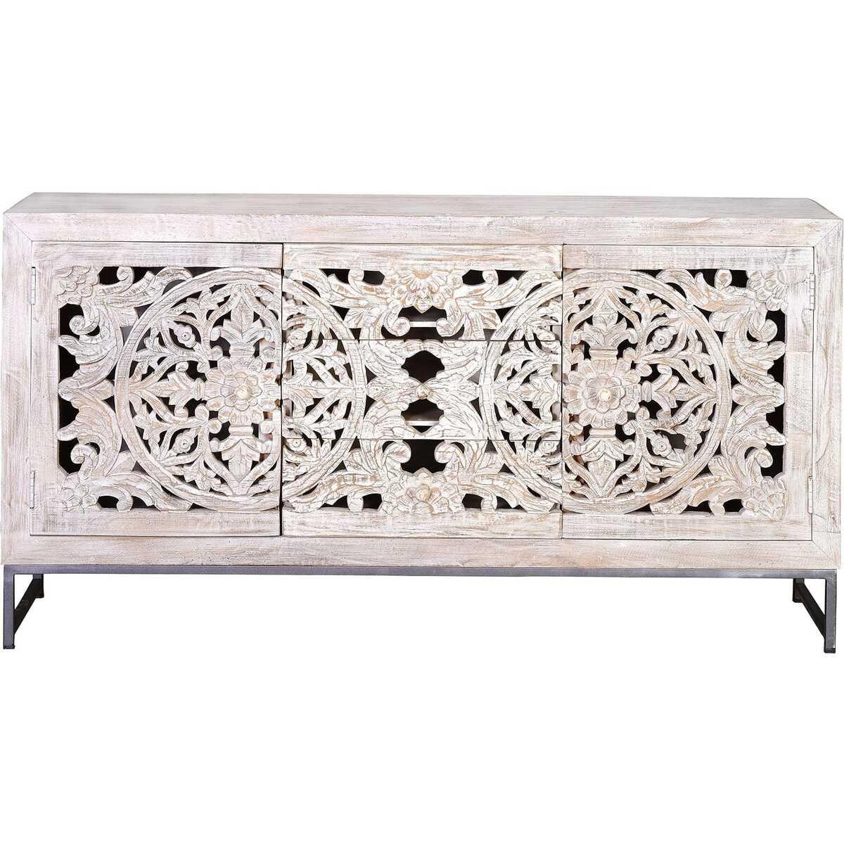Sideboard aus Mangoholz mit 2 Türen, 3 Schubladen und Innenböden. Fronten mit handgefertigten Details. Fuss aus Eisen. Grösse der Fronten der Schubladen: 18 x 50 cm. Innenmasse der Schubladen: 14 x 43 x 29 cm. Türen Masse: 54 x 45 cm. Höhe der Innenböden: 27 cm. Höhe der Beine: 15 cm