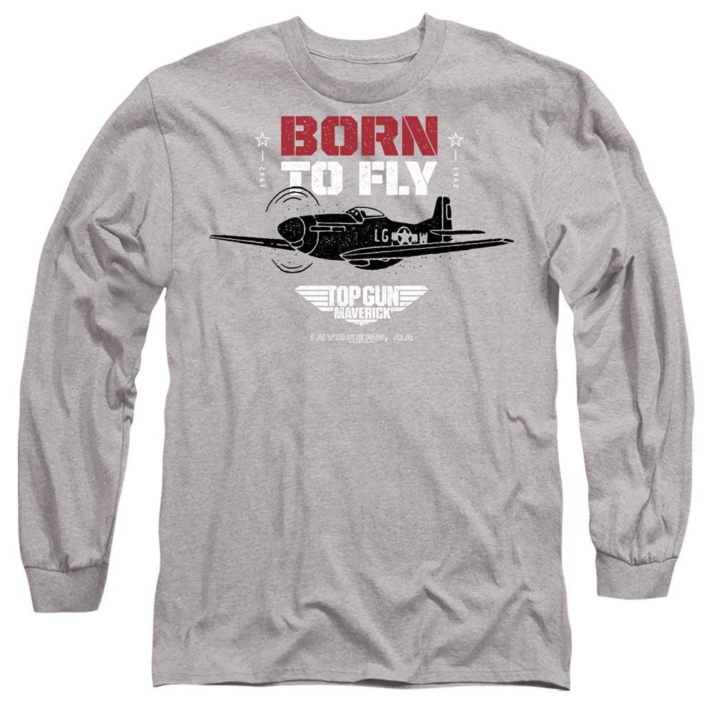Dieses Langarm-T-Shirt verfügt über einen Grafikdruck, der vom ikonischen Top Gun Maverick Film inspiriert ist. Das Design zeigt ein Vintage-Flugzeug mit dem Text "BORN TO FLY" und "TOP GUN MAVERICK INYOKERN, CA", was es zu einem unverwechselbaren Stück für Fans macht.