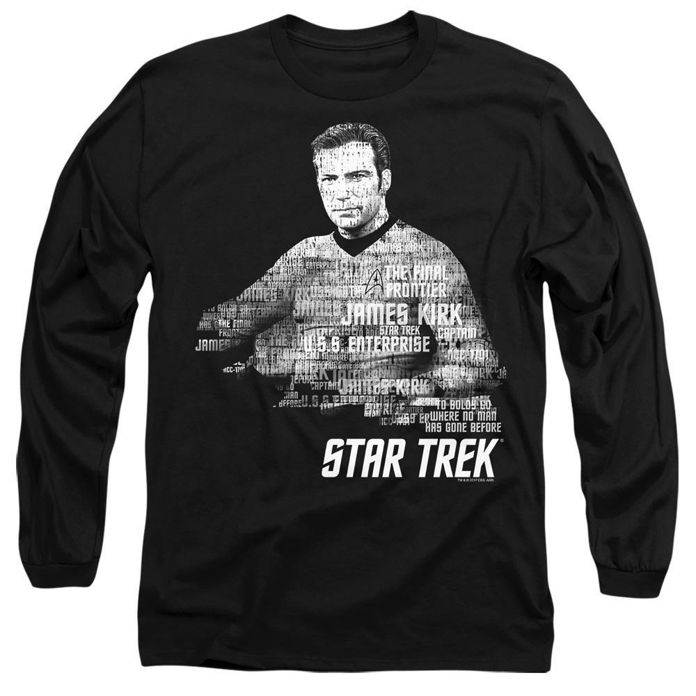 Dieses Langarm-T-Shirt zeigt ein einzigartiges Grafikdesign von Captain James T. Kirk aus Star Trek, das vollständig aus Wörtern und Phrasen besteht, die mit der ikonischen Figur und Serie in Verbindung stehen. Das Design erzeugt einen auffälligen visuellen Effekt und macht es zu einem unverwechselbaren Stück für Fans.
