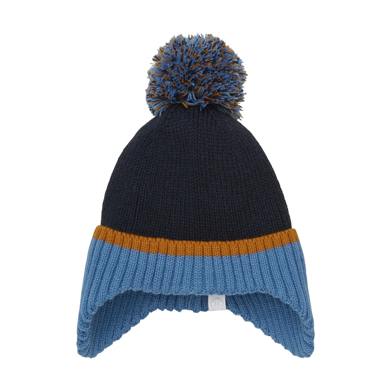 Gestrickte Babymütze aus einer weichen und bequemen Wollqualität mit einem Pelzbommel oben. Die Mütze hat eine Windstopp-Funktion, die eine zusätzliche Schicht aus Stoff an den Ohren zum Schutz vor Wind umfasst. Die Mütze hat ein reflektierendes Logo an der Seite.