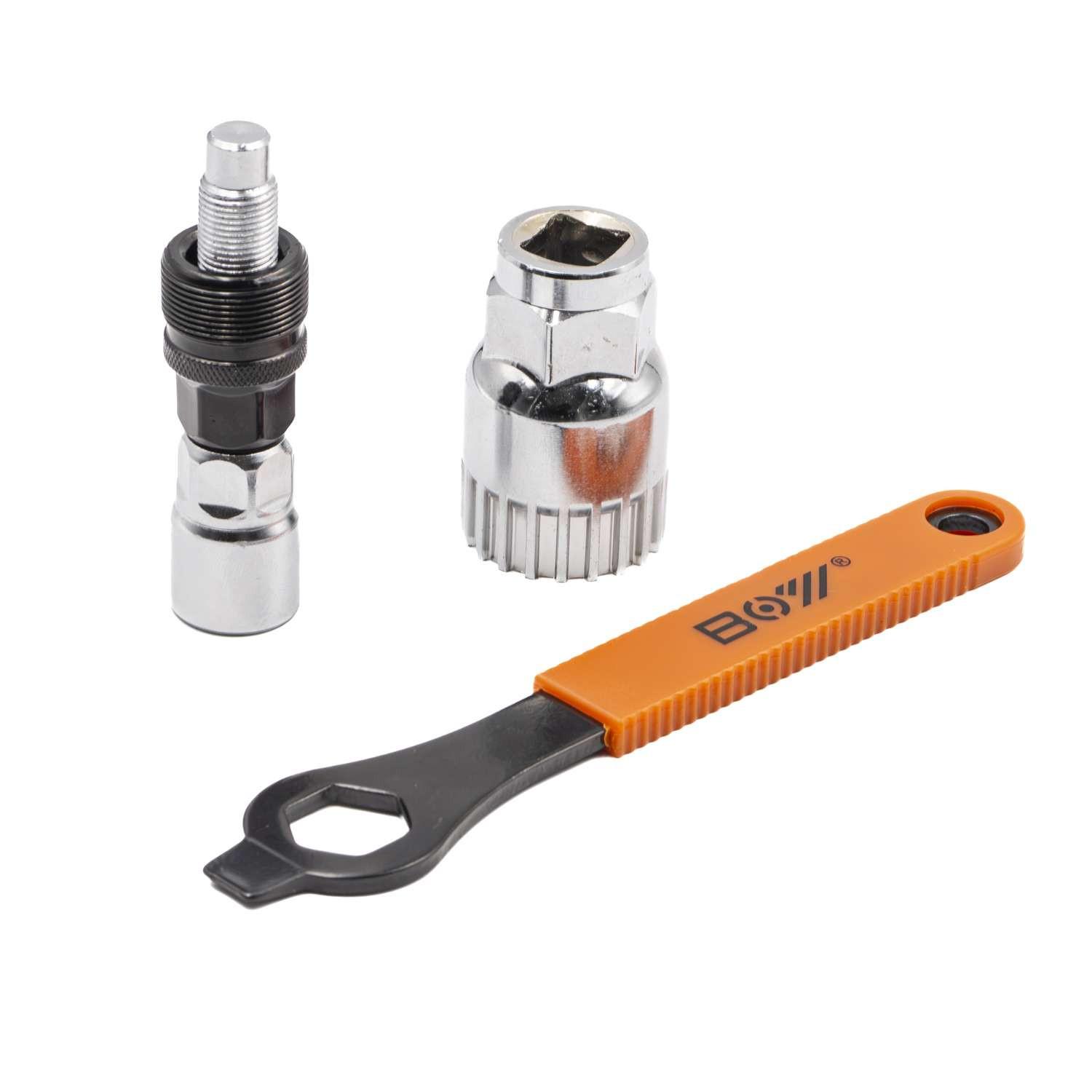 Das 3-teilige Set besteht aus einem Kurbelabzieher, einem Tretlagerabzieher und einem Schraubenschlüssel, der Ihnen dabei hilft, die Komponenten fest anzuziehen oder zu lösen.