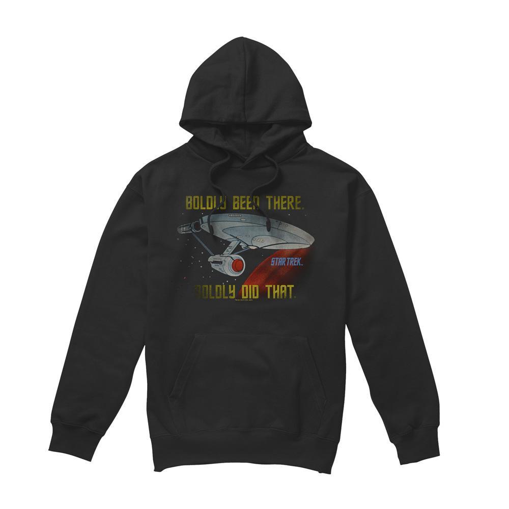 Dieser Kapuzenpullover zeigt einen von Star Trek inspirierten Grafikdruck, der die ikonische USS Enterprise mit den Phrasen "BOLDLY BEEN THERE" und "BOLDLY DID THAT" präsentiert. Er ist eine bequeme und stilvolle Wahl für Fans der klassischen Science-Fiction-Serie.