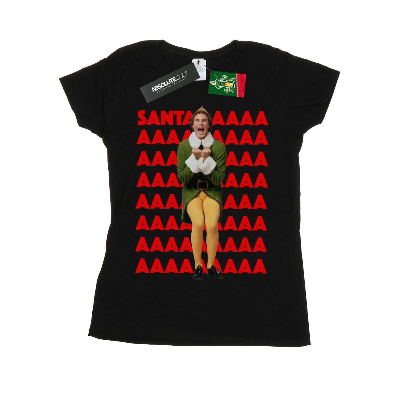 Dieses Damen-T-Shirt verfügt über einen klassischen Rundhalsausschnitt und kurze Ärmel und bietet eine bequeme und vielseitige Passform. Das Design zeigt einen grafischen Druck von Buddy dem Elf mit dem ikonischen Satz "SANTA! I KNOW HIM!" in einer kräftigen, auffälligen Schrift.
