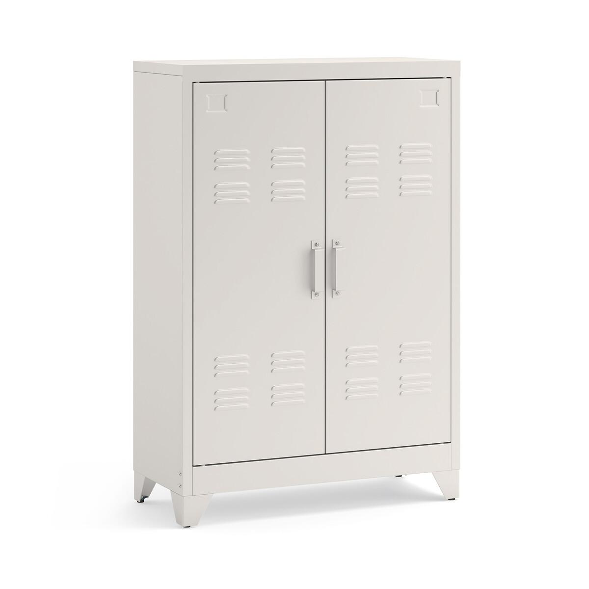 Mit seinem Industrial Design bringt der niedrige Metallschrank Hiba mit 2 Türen eine Vintage-Note ins Zimmer. Perfekt für das Schlafzimmer, wo der Schrank auch unter einer Dachschräge stehen kann.
