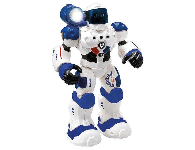 Der Polizei Roboter kann für bis zu 50 Handlungen programmiert werden. Dank der Spion-Funktion kann er Worte aufnehmen und wiedergeben. Er tanzt zu Robotermusik. Mit LED-Lampe und Polizei-Tönen: Sirene, Warnung, Schüsse. USB-Ladeanschluss.