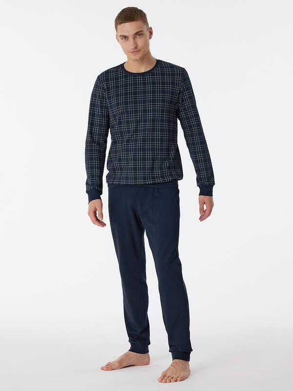Dieser Pyjama bietet Komfort und Stil für entspannte Stunden. Das gemusterte Rundhals-Oberteil verfügt über eine aufgesetzte Brusttasche, während die lange, unifarbene Hose mit einem Komfortbund ausgestattet ist. Das Set ist mit bequemen Bündchen an den Abschlüssen versehen.