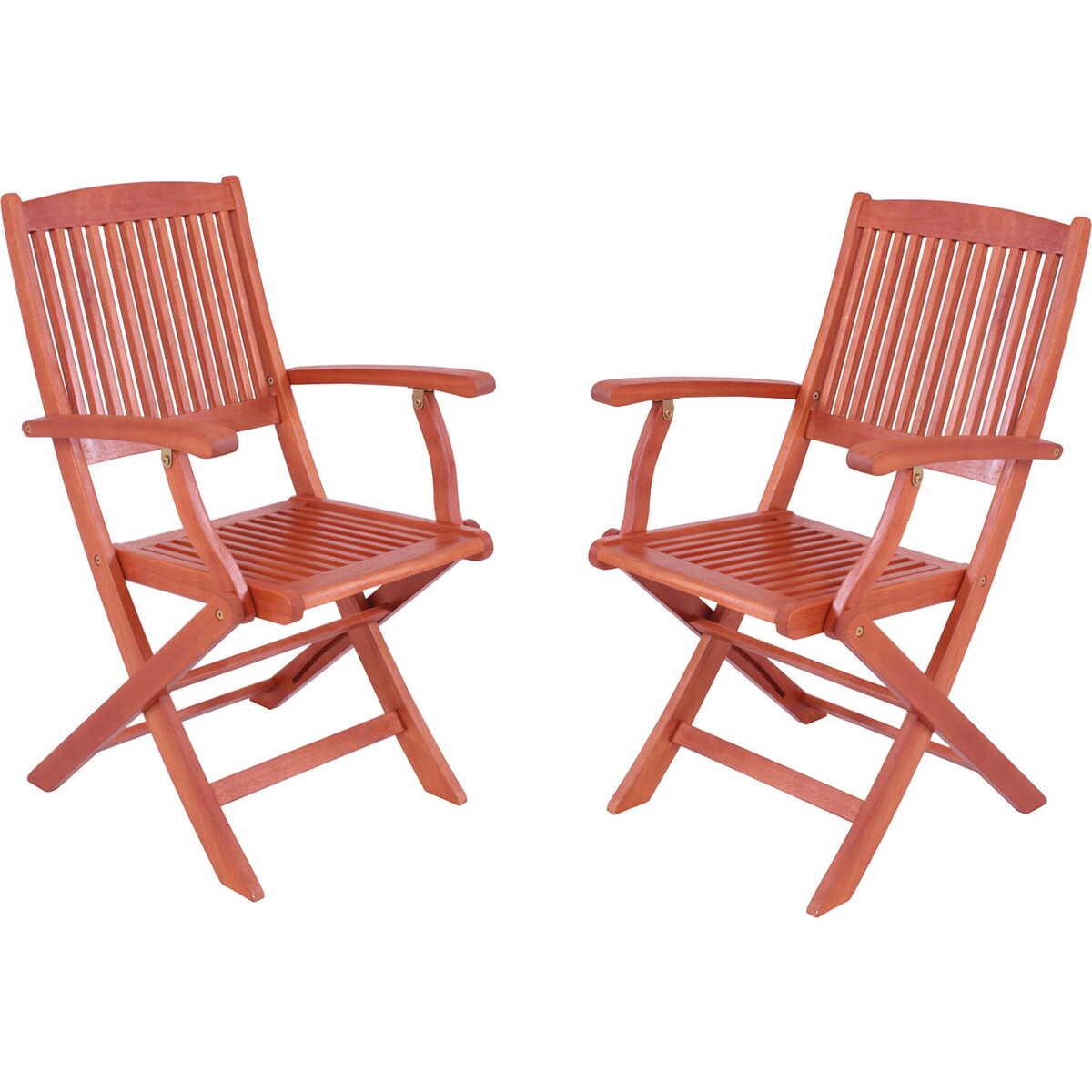 Hergestellt aus 100% zertifiziertem Eukalyptusholz Stilvolles Design und warme, natürliche Optik Armlehnen für zusätzlichen Komfort Klappfunktion für platzsparende Lagerung und Transport Anpassungsfähig für verschiedene Outdoor-Umgebungen Maximale Belastbarkeit von 100 kg Set enthält zwei Stühle