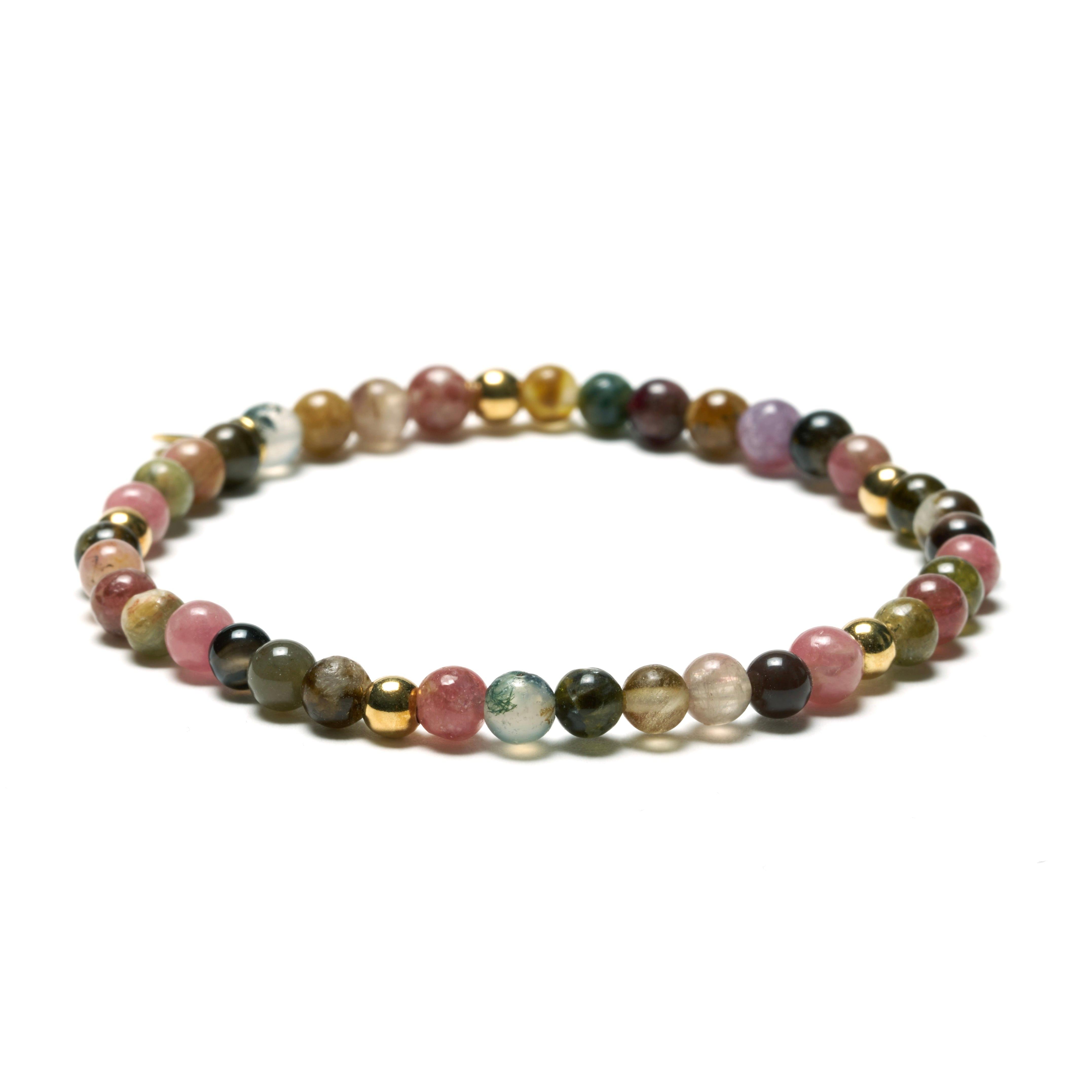 Dieses elegante Damenarmband vereint fein geschliffene, 4mm runde Turmalin-Edelsteine mit edlen, 14 Karat vergoldeten Silberperlen. Die natürliche Farbvielfalt der Turmaline von zarten Rosé- bis hin zu kräftigen Grüntönen verleiht dem Armband eine lebendige, doch harmonische Ausstrahlung.