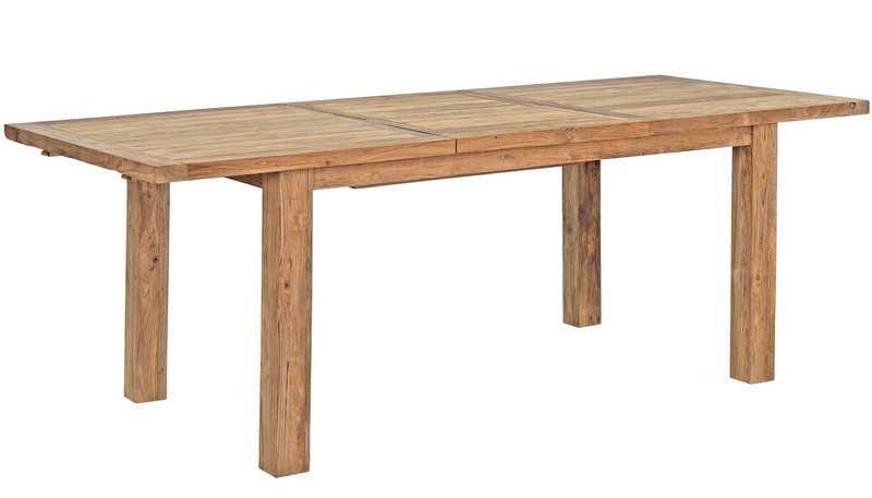 Recyceltes Teakholz (SVLK), rustikale Ausführung, Tischplattendicke 4 cm, Beine 8,5x8,5 cm. Metallteile aus Edelstahl. Gleitstange aus Aluminium. Beine zu montieren.