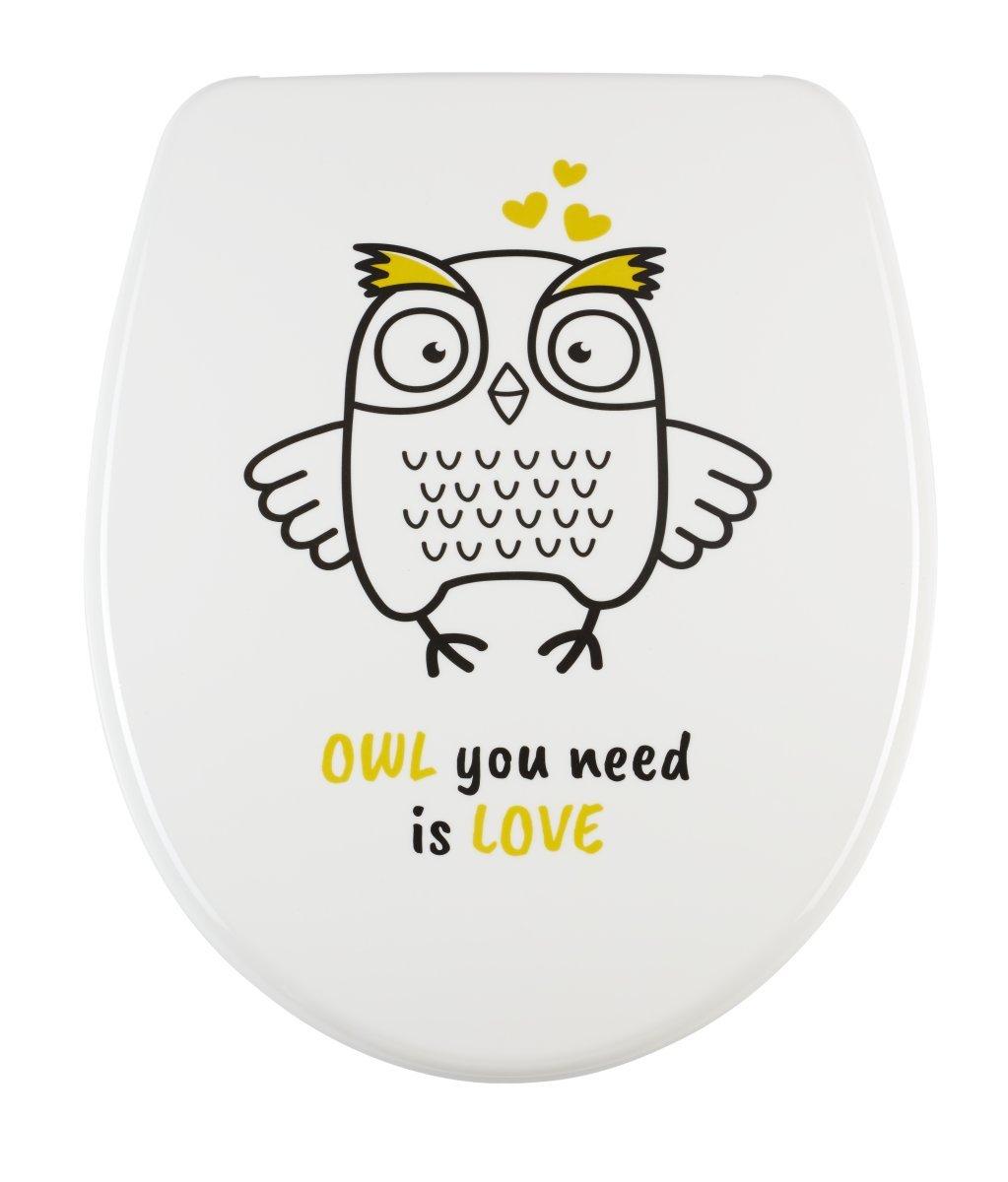 diaqua® WC-Sitz Nice Slow Down Owl 41 - 46.5 X 36.5 CM 2 - WC-Sitz mit Absenkautomatik für sanftes Schliessen von Deckel und Brille (Slow Down), Einknopfdrucktechnik mit praktischer Betätigung, zum Reinigen einfach abnehmbar (Easy Cleaning Push). Rasche Montage durch verstellbare und einfache Befestigung, aus pflegeleichtem und langlebigem Duroplast, universelle Passform für alle handelsüblichen WC-Anlagen, inkl. Befestigungsmaterial.