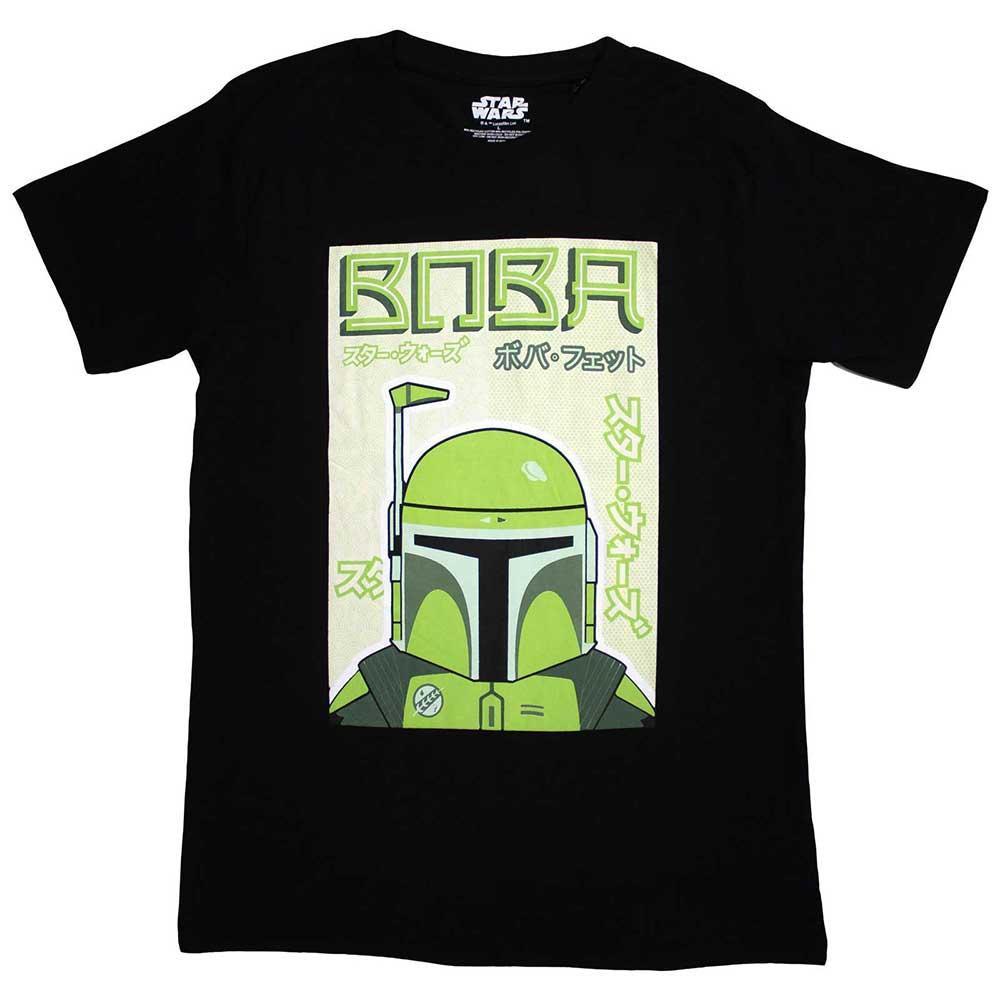Dieses T-Shirt verfügt über einen klassischen Rundhalsausschnitt und kurze Ärmel, was es zu einer bequemen und vielseitigen Ergänzung für jede Garderobe macht. Die Vorderseite des Shirts zeigt einen auffälligen Grafikdruck von Boba Fetts ikonischem Helm, begleitet von japanischer Schrift, was den Fans des legendären Kopfgeldjägers eine einzigartige und stilvolle Note verleiht.