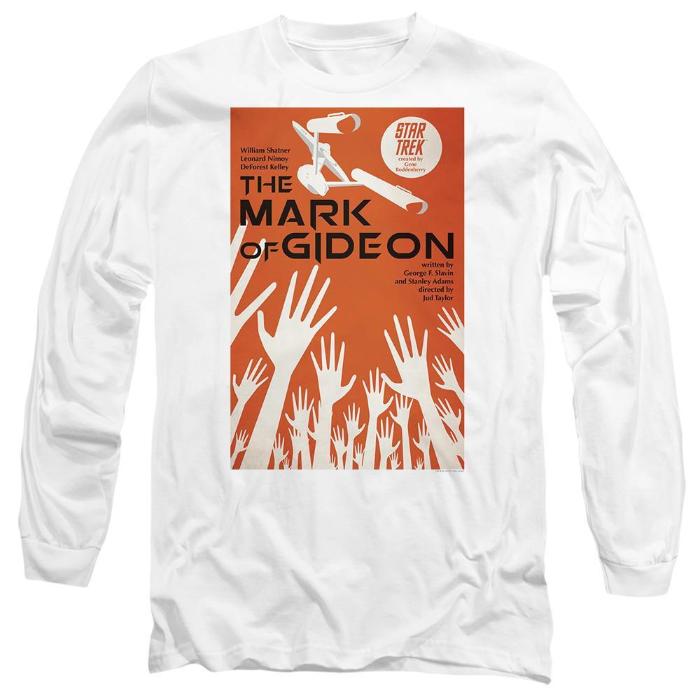 Dieses T-Shirt zeigt einen Grafikdruck, der von Star Trek: The Original Series Episode 71, "The Mark of Gideon", inspiriert ist. Das Design präsentiert ein Poster im Vintage-Stil mit dem Episodentitel, den Darstellern und Crew-Details, vor einem orangefarbenen Hintergrund mit greifenden Händen und der USS Enterprise.