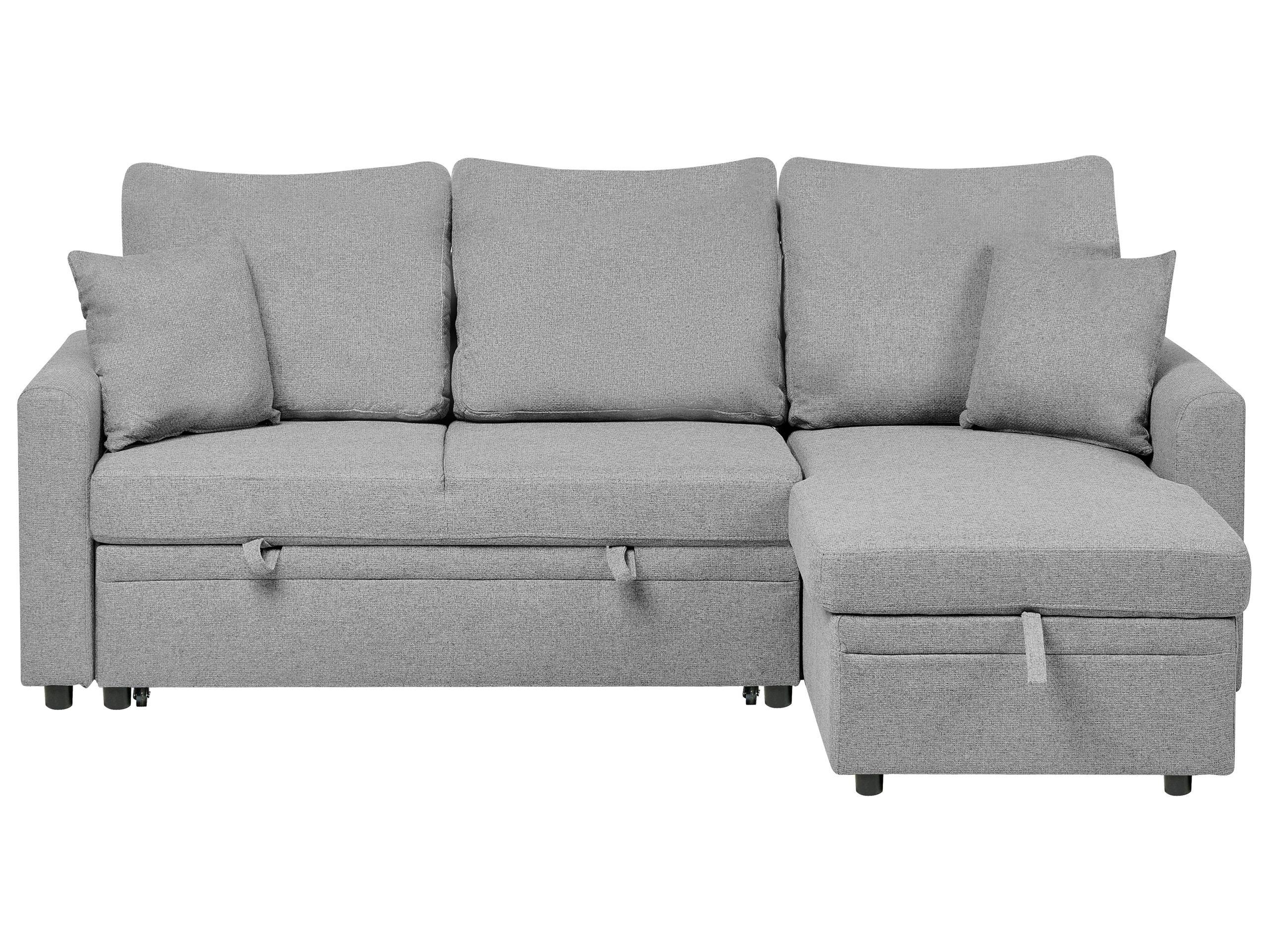 Moderne Eckschlafcouch mit Kissen und Stauraum. Verleihen Sie Ihrem Wohnzimmer ein stilvolles Update mit diesem modernen Schlafsofa, das mit hochwertigem Leinenstoff bezogen ist. Die dick gepolsterte Sitzfläche sorgt für langanhaltenden Komfort, während sich das Sofa dank der praktischen Mechanik im Handumdrehen in eine grosszügige Liegefläche für Gäste verwandeln lässt. Passende Zierkissen sind ebenfalls im Lieferumfang enthalten. Der strapazierfähige Bezug ist besonders pflegeleicht und ein häufiges Reinigen ist nicht nötig. Ein verstecktes Staufach unter der Sitzfläche bietet Platz für Bettwäsche oder andere Gegenstände.